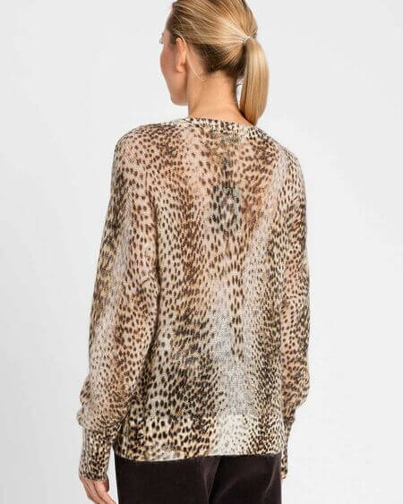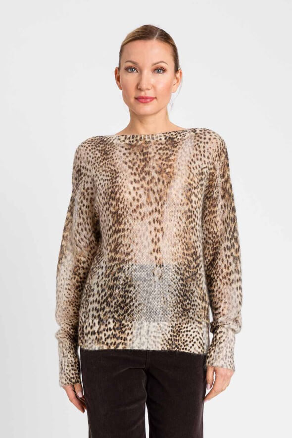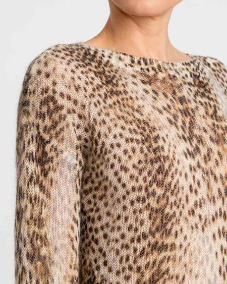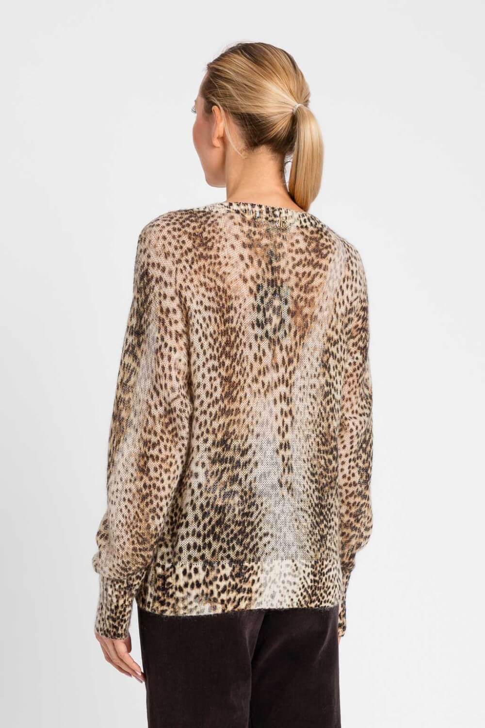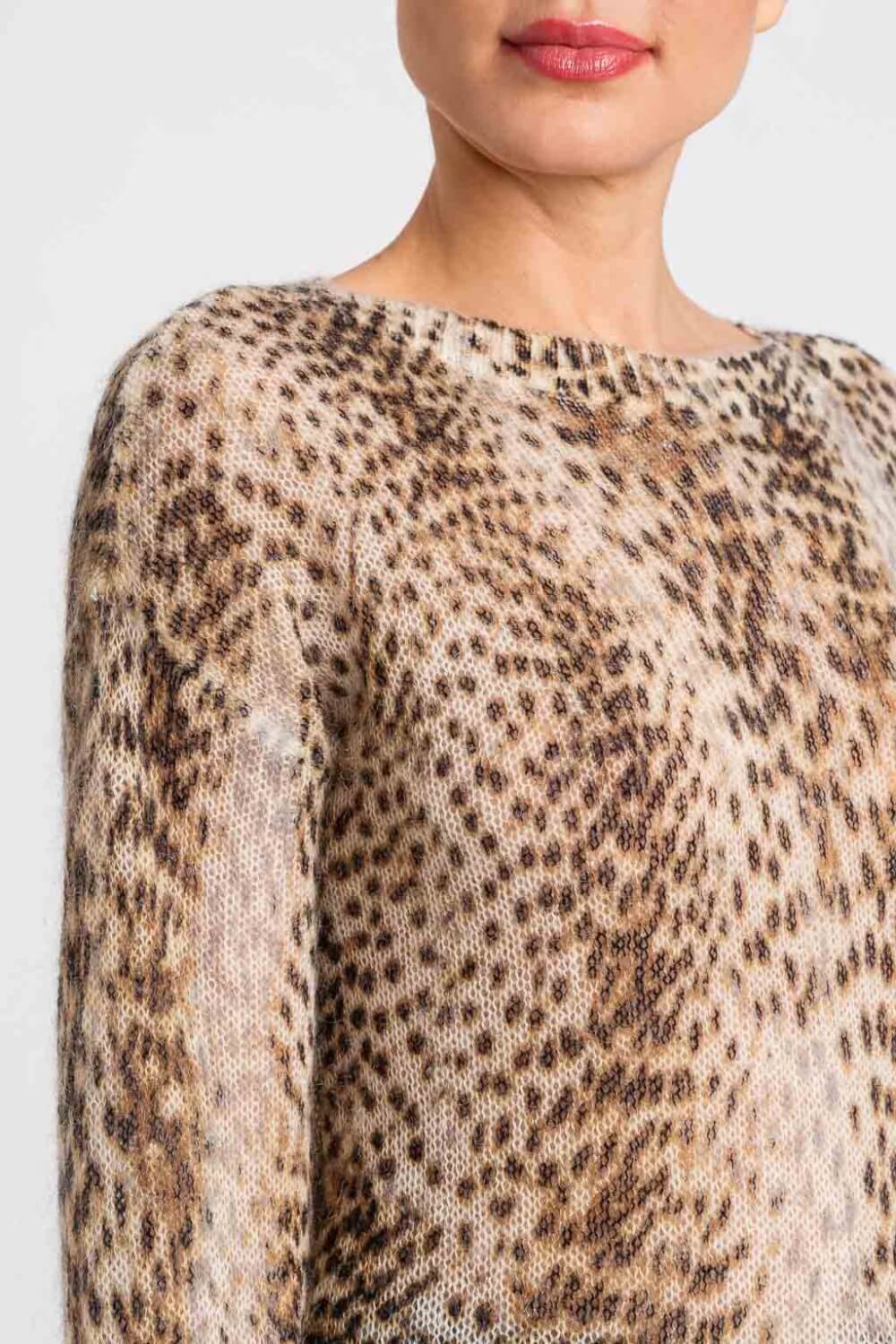 Suéter TWINSET de mohair y lana con punto muy fino y estampado de leopardo. Cuello barco, manga larga con puños, hombros caídos, bajo festoneado y corte holgado.
