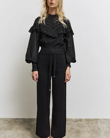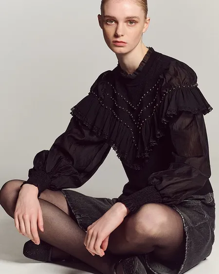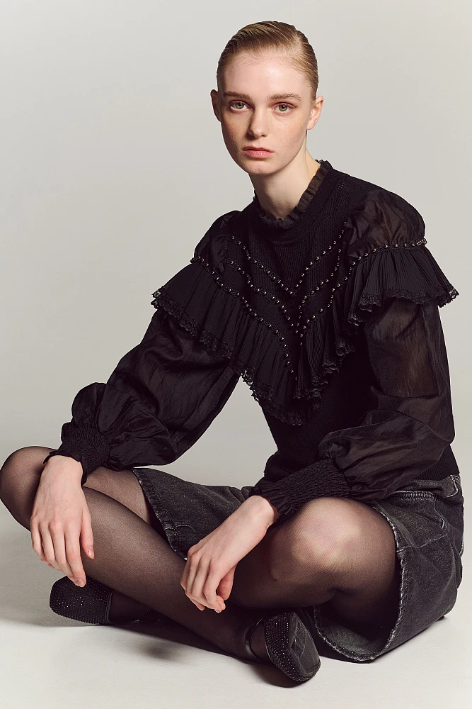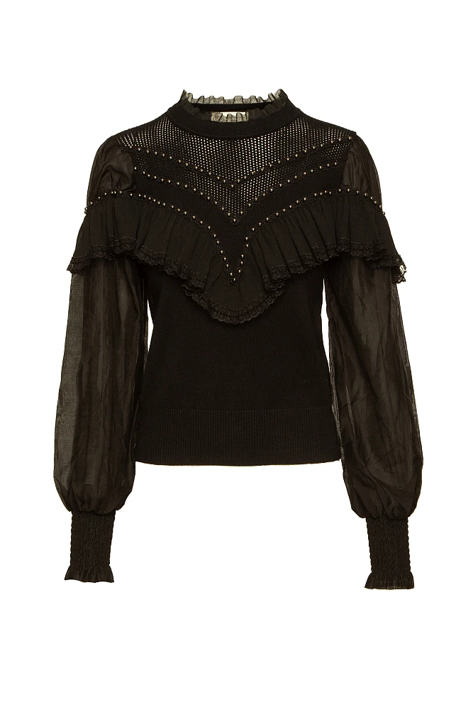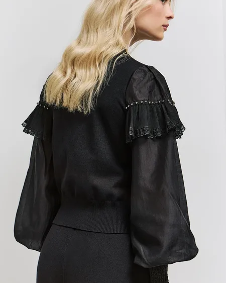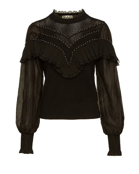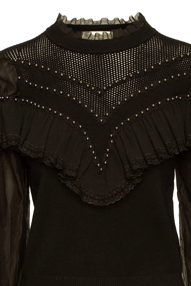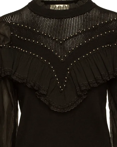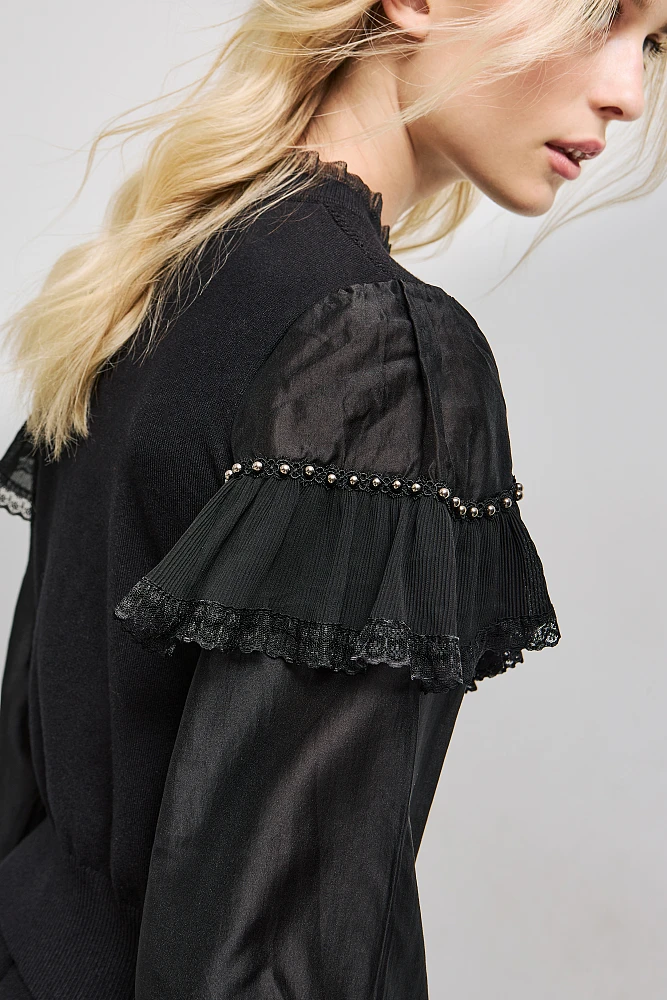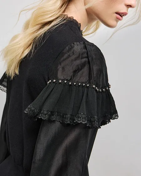 Jersey con mangas y abalorios de tul, manga larga, tejido elástico, con detalles de bordado y calado, con cuello alto, tejido acanalado en los puños, corte regular