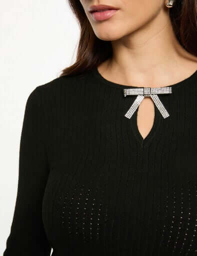 - Este jersey ajustado de largo medio realza las formas con elegancia gracias a su corte favorecedor. El detalle del lazo aporta un toque femenino y sofisticado, mientras que los strass añaden un brillo sutil para un estilo refinado. Los accesorios integrados transforman esta prenda en un verdadero tesoro de moda.