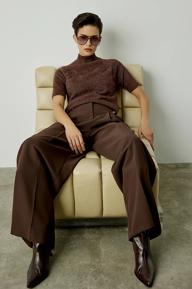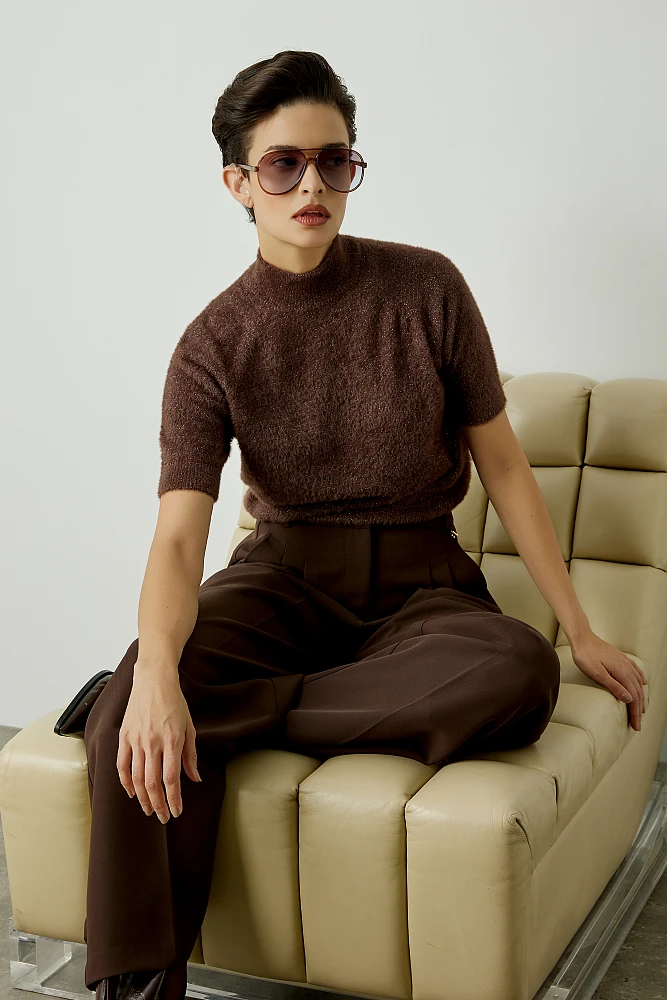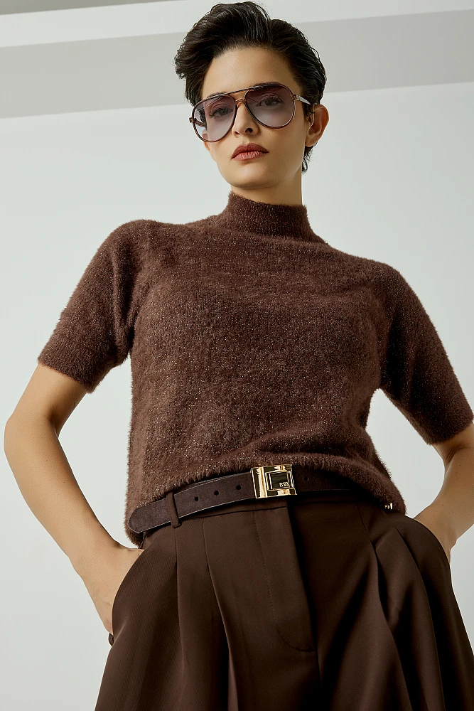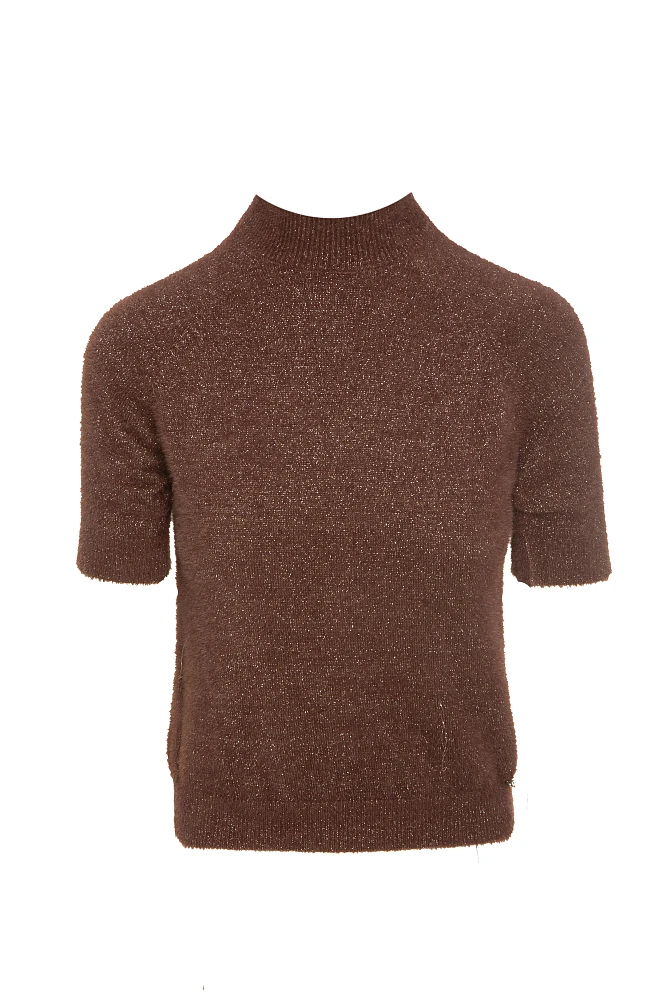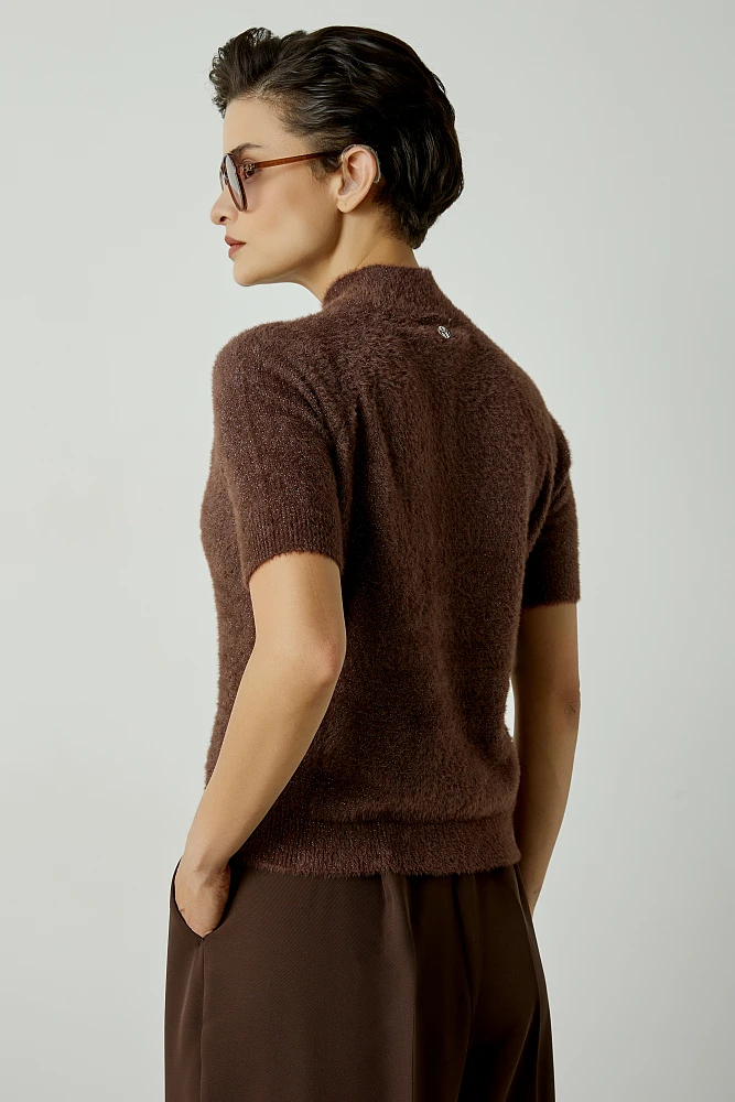 Jersey de manga corta, cuello alto, diseño recto, tacto peludo