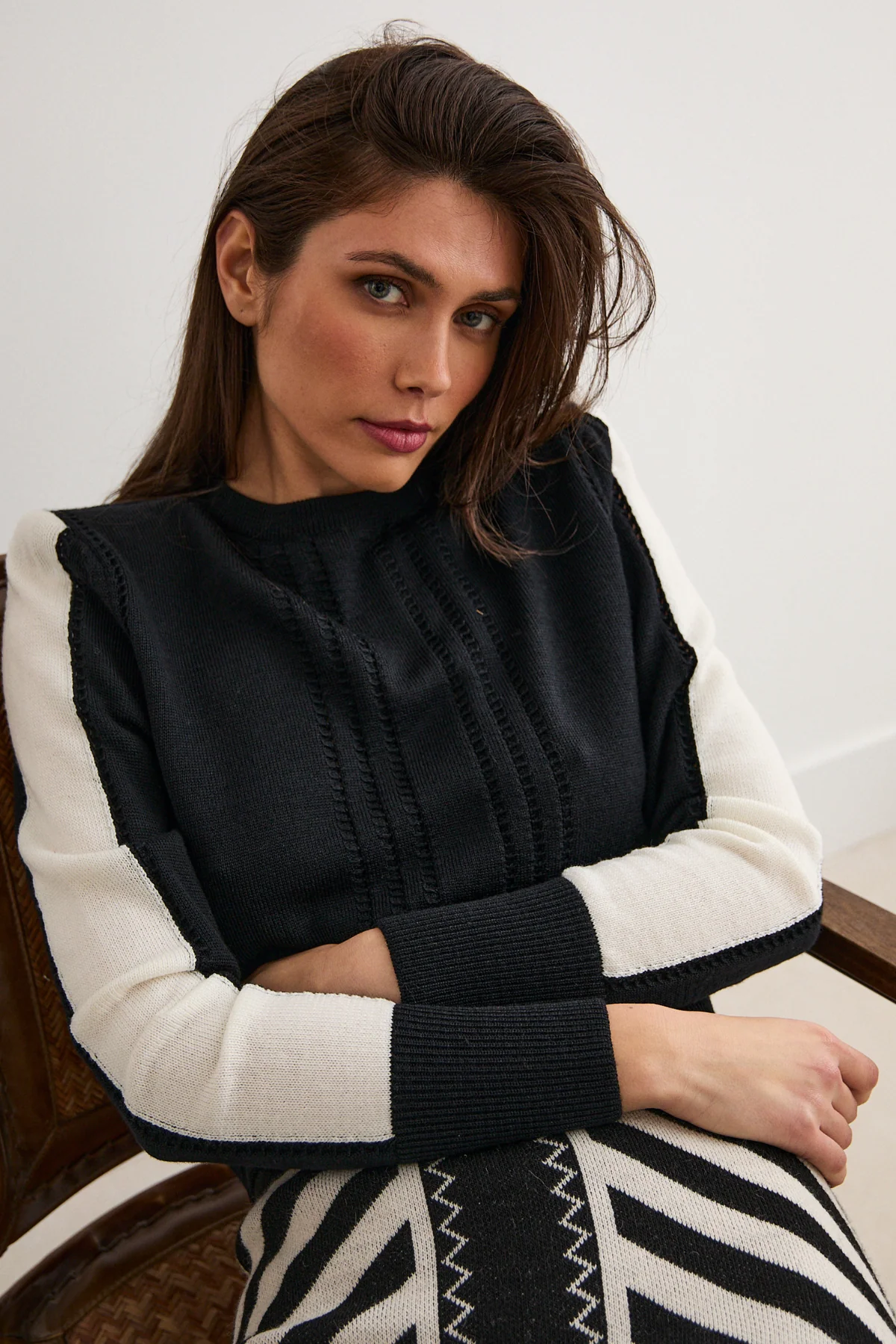 El jersey Querin en tono negro y blanco destaca por su sofisticación y sencillez elegante. Confeccionado en un tejido de punto fino, presenta un diseño estructurado con sutiles detalles acanalados verticales en la parte frontal, que aportan textura sin sobrecargar el look.