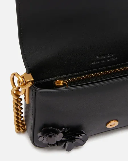 Bolso de hombro pequeño Baby Love Bag Slouchy de piel. Caracterizado por una correa bandolera ajustable de piel y cadena para llevarlo al hombro o cruzado, el bolso resulta extremadamente elegante y práctico. En este modelo de noche destacan varios bordados de lentejuelas en forma de flor, para regalarte un look brillante, mientras que el toque final lo aporta la hebilla Love Birds Diamond Cut, portavoz del inimitable estilo de la marca. El interior presenta un forro de dril de algodón e incluye un bolsillo plano con cierre de cremallera.