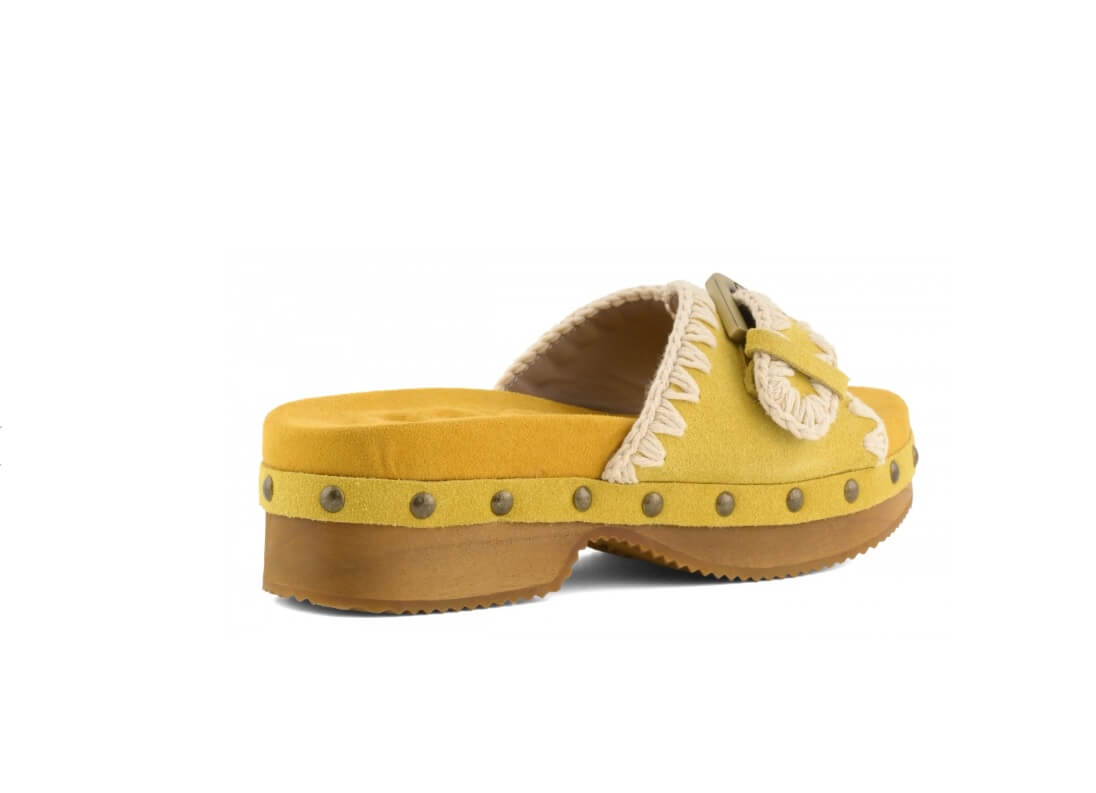 El zueco de madera de tacón bajo con hebilla es el calzado perfecto para el verano. Confeccionado en ante de alta calidad con el característico punto de ganchillo y detalles de tachuelas metálicas. Cuenta con una suela de madera y goma que proporciona un buen soporte, y una plantilla acolchada para mayor comodidad. Altura del zueco 3.5cm.