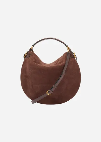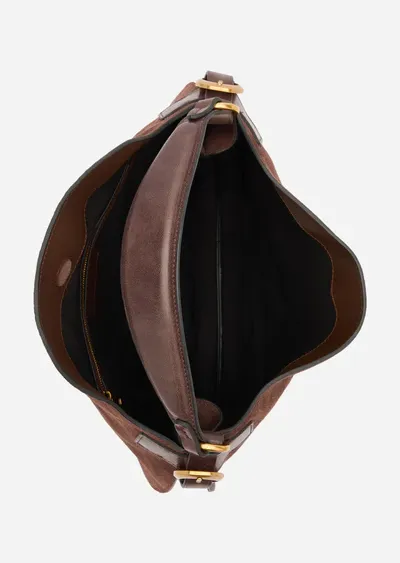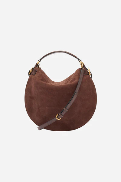 Bolso hobo grande confeccionado en ante de color uniforme. Los insertos laterales en cuero de contraste evocan la artesanía tradicional. Asa estructurada y correa desmontable, ambas en cuero de color contrastante. Placa metálica dorada grabada con el logotipo en la parte inferior frontal.