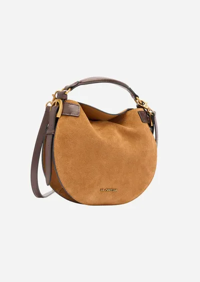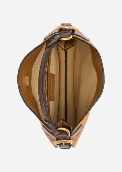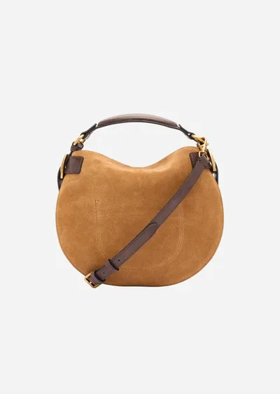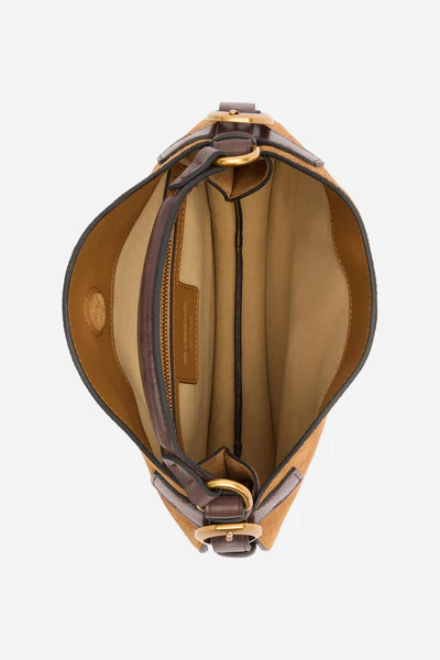 Bolso hobo mediano confeccionado en ante de color uniforme con insertos laterales de cuero en contraste. Cierre magnético oculto, asa estructurada y correa desmontable de cuero en tono contrastante. Placa dorada grabada con el logotipo en la parte inferior frontal.