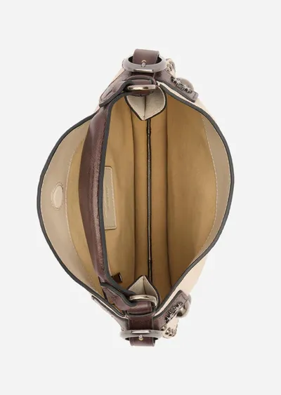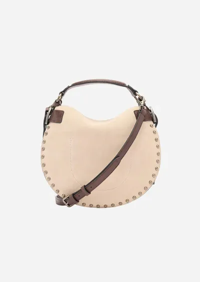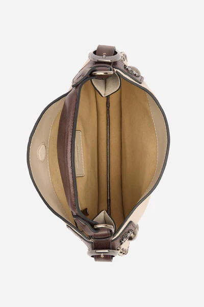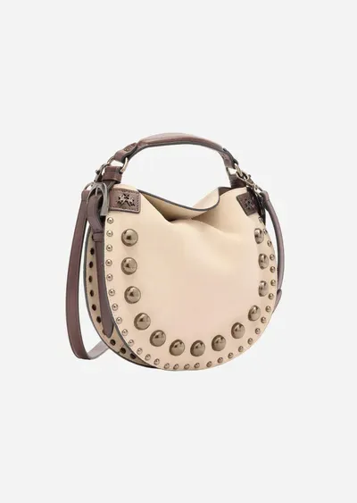 Bolso hobo pequeño confeccionado en ante de color uniforme. Los insertos laterales de cuero están decorados con el icónico logotipo metálico de la marca. En el frente, un adorno de tachuelas doradas en diferentes tamaños crea un sofisticado juego de luces y volúmenes.