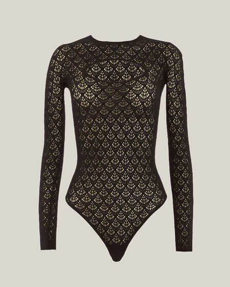 Patrón geométrico en forma de escamas / Troquelado femenino / Rejilla de punto por urdimbre / Fabricado con hilo ECONYL® reciclado / Teñido sostenible / Mate / Sin costuras, tejido en una sola pieza / Tacto sumamente fino y suave / Tejido en máquina de calcetería / Corte ajustado / Escote redondo / Manga larga con puños sin rematar / Refuerzo de algodón / Cierre automático