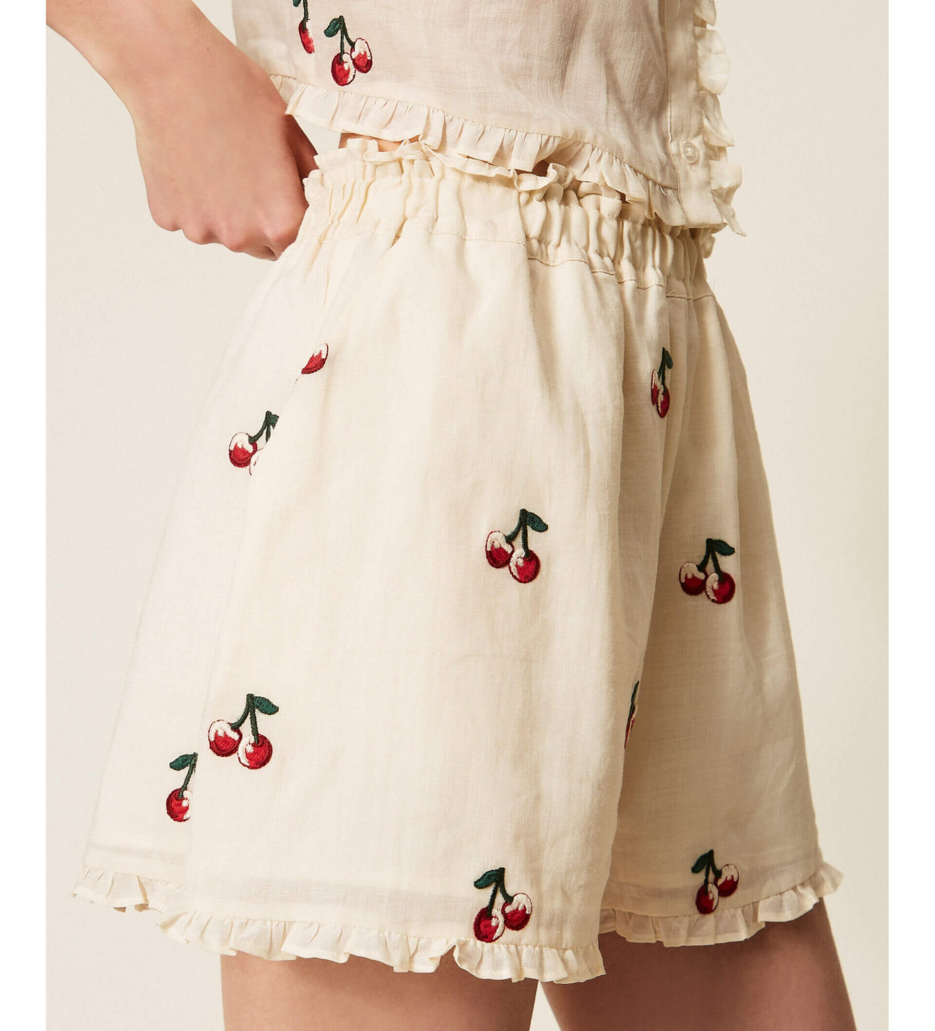 Pantalón de ramio con bordados de cereza por toda la prenda, un diseño exclusivo de Twinset.