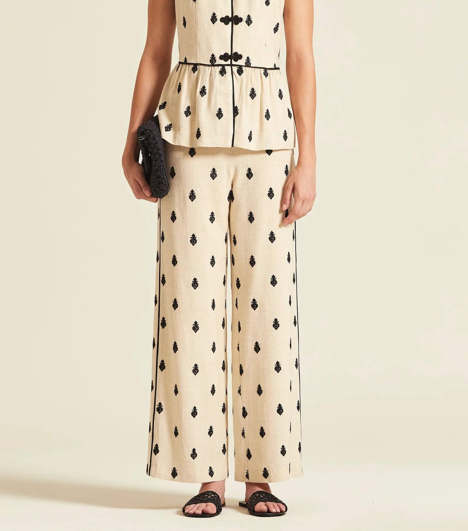 Pantalón de corte recto y fluido confeccionado en mezcla de viscosa y lino en tono crudo. Presenta un elegante bordado geométrico integral, y una cómoda cintura elástica que permite un ajuste relajado y favorecedor.