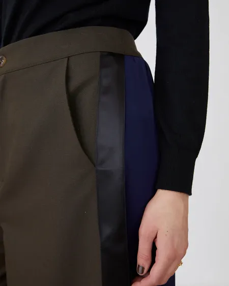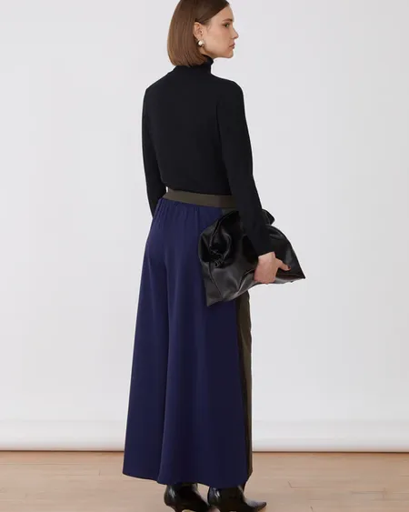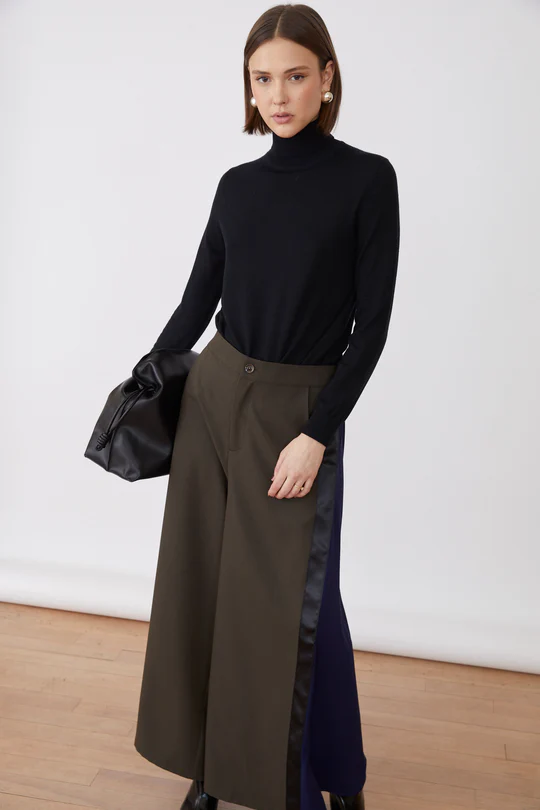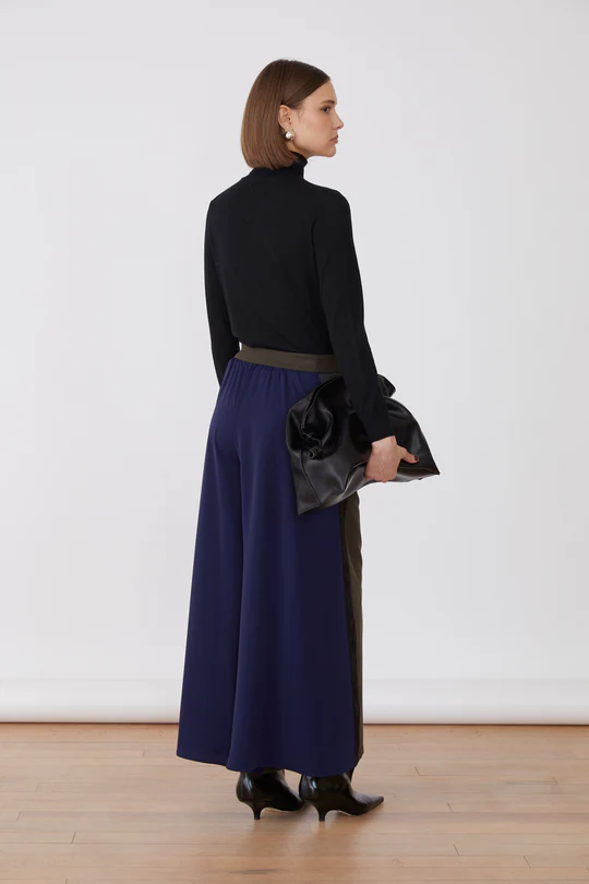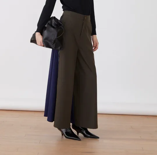 Estos pantalones TOTO cuentan con una sofisticada mezcla de materiales mixtos que mejoran tanto la comodidad como el estilo. El frente azul marino plisado agrega una textura refinada, contrastando elegantemente con los paneles frontales de color caqui suave. Diseñados con una silueta de pierna ancha, ofrecen un movimiento fluido y elegante, perfecto para un look pulido pero relajado. Ideal para elevar tu guardarropa con un lujo discreto y un diseño fluido.