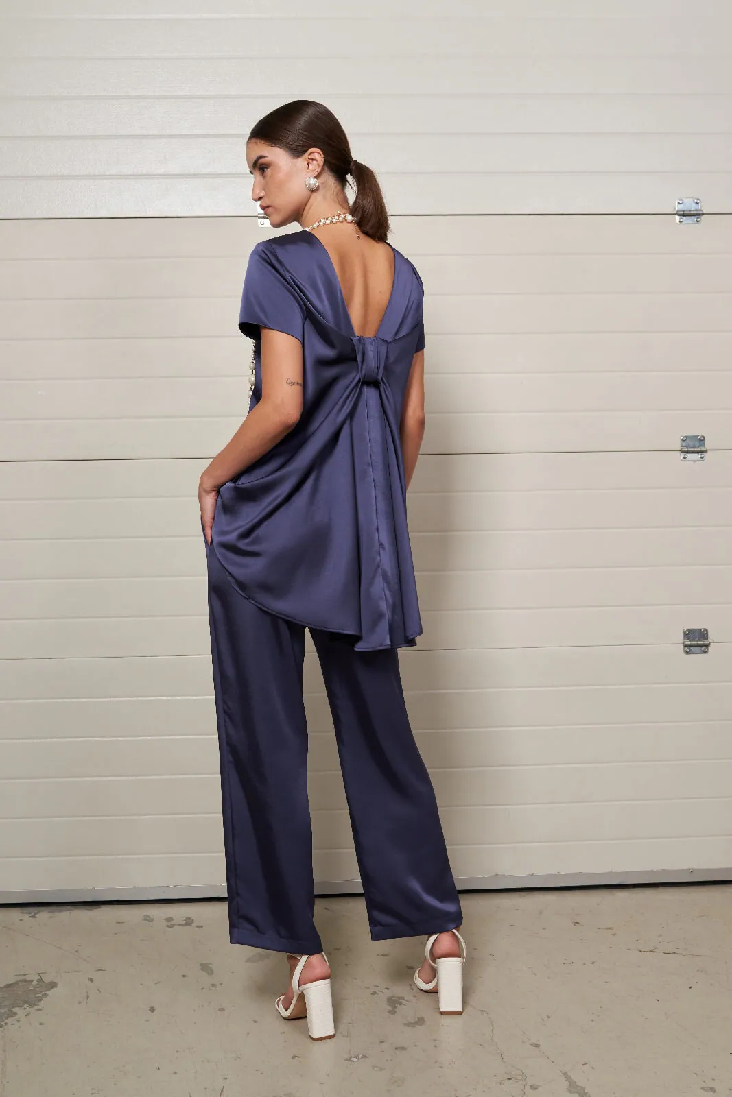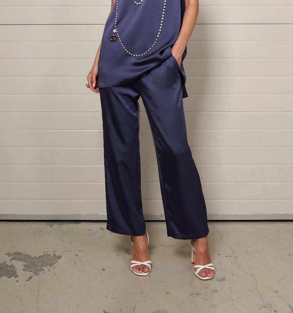 Pantalón recto en tejido fluido en color azul noche. Bolsillos laterales y cinturilla elástica.