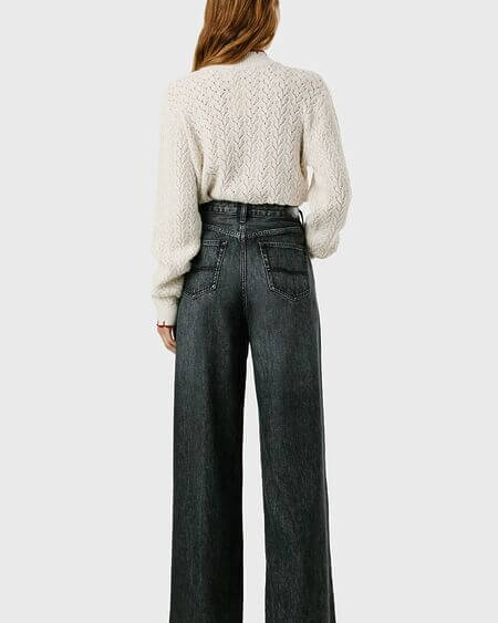 Vaqueros de tiro ultra alto con la pernera más ancha de nuestra colección. Confeccionados en auténtico denim negro suave al tacto con efecto lavado a la piedra.