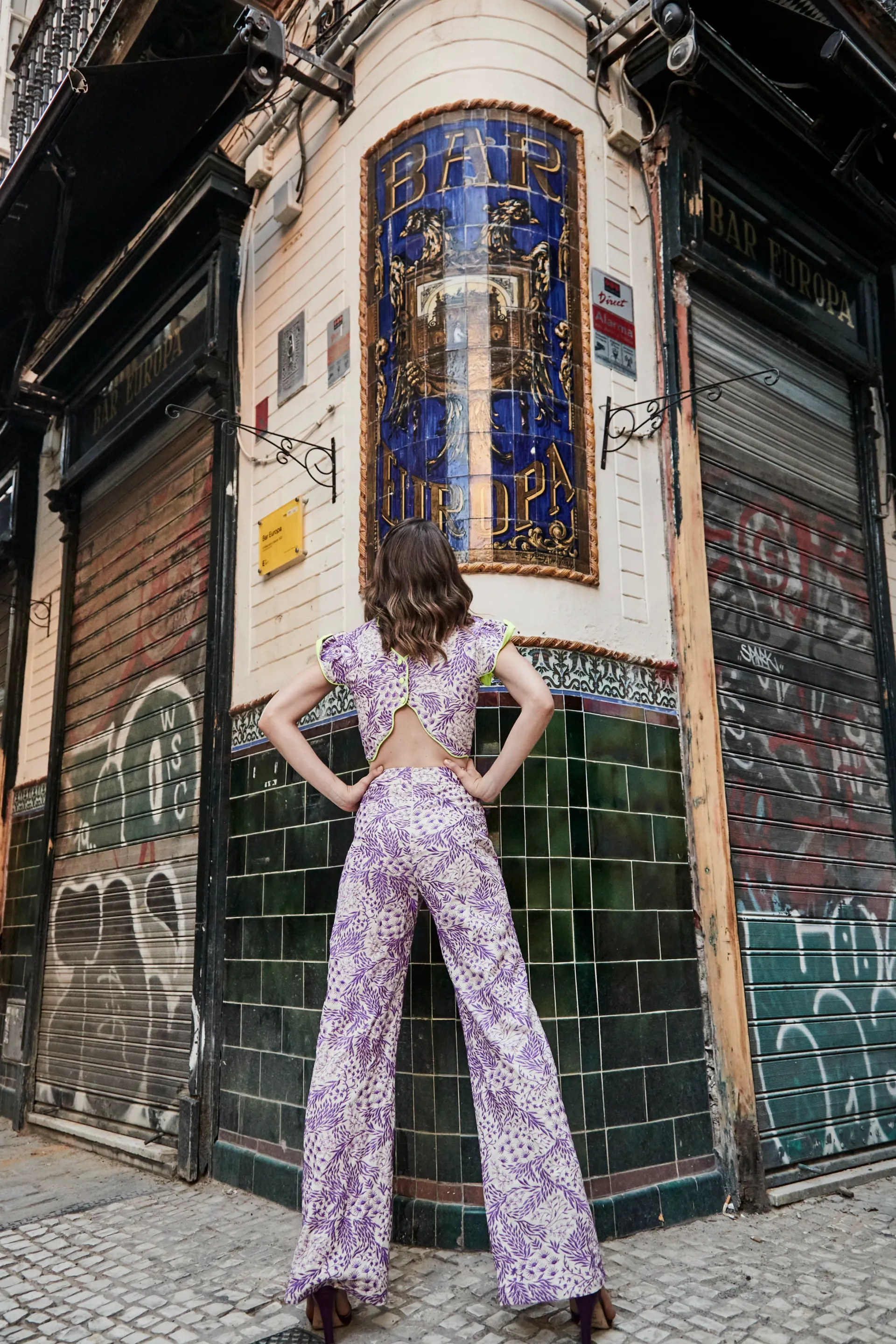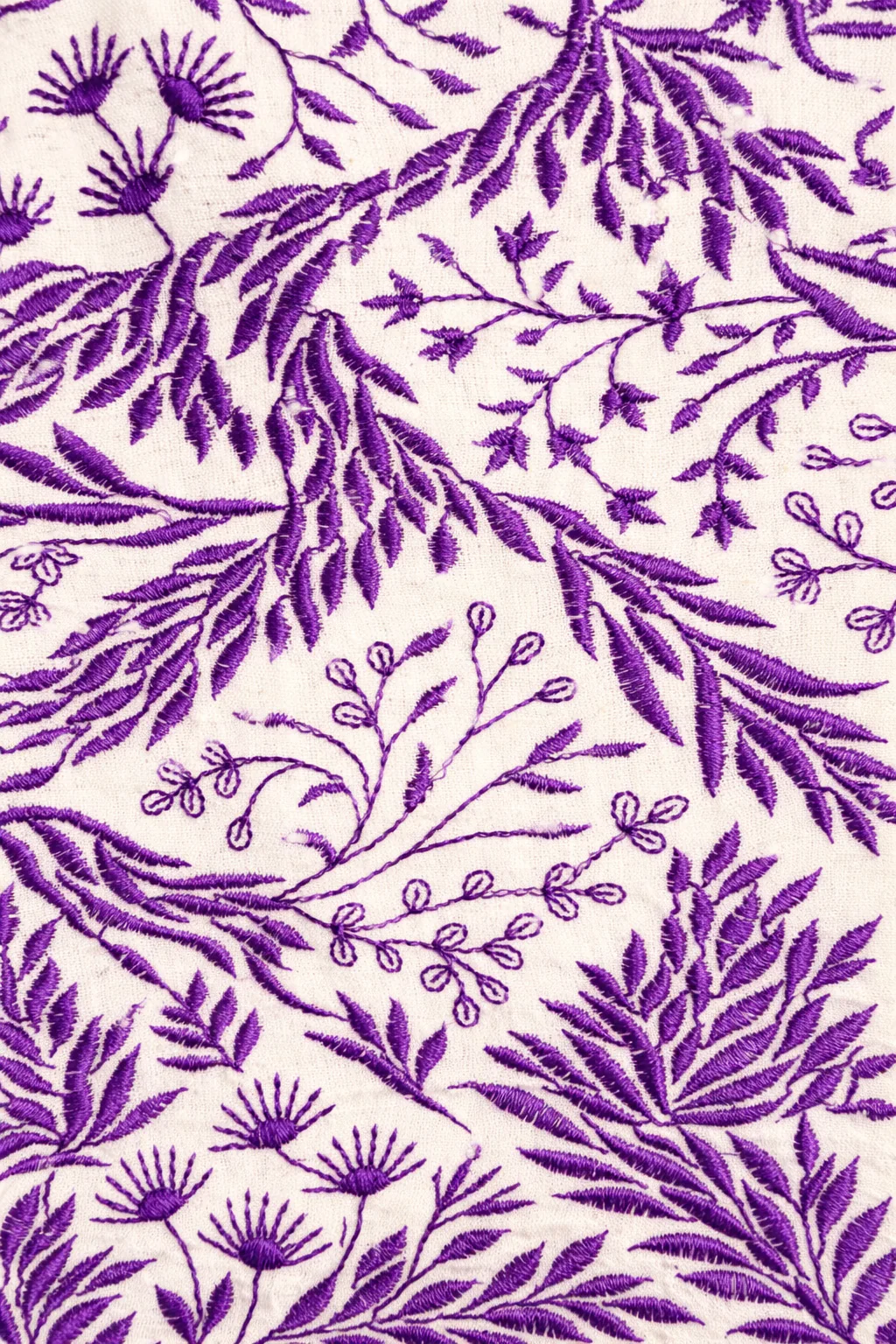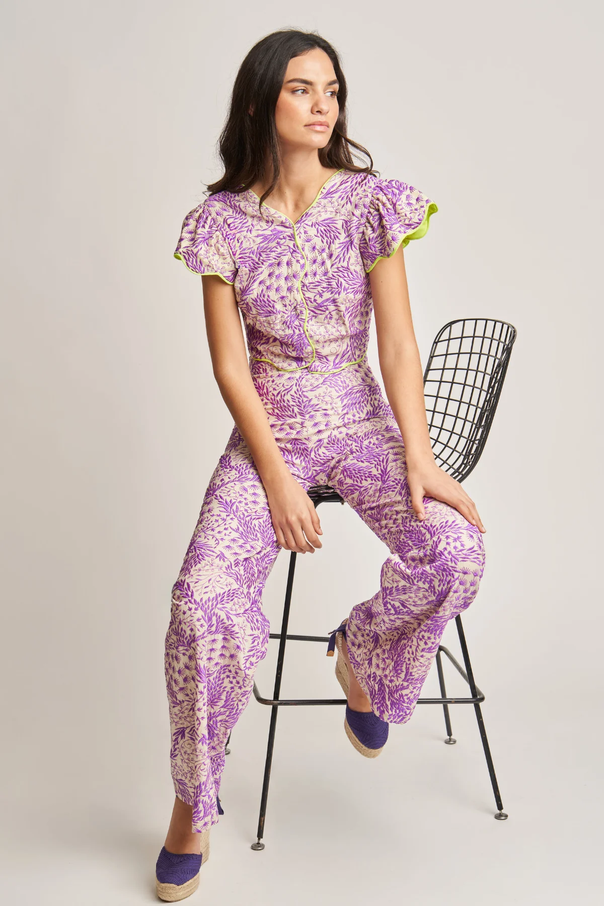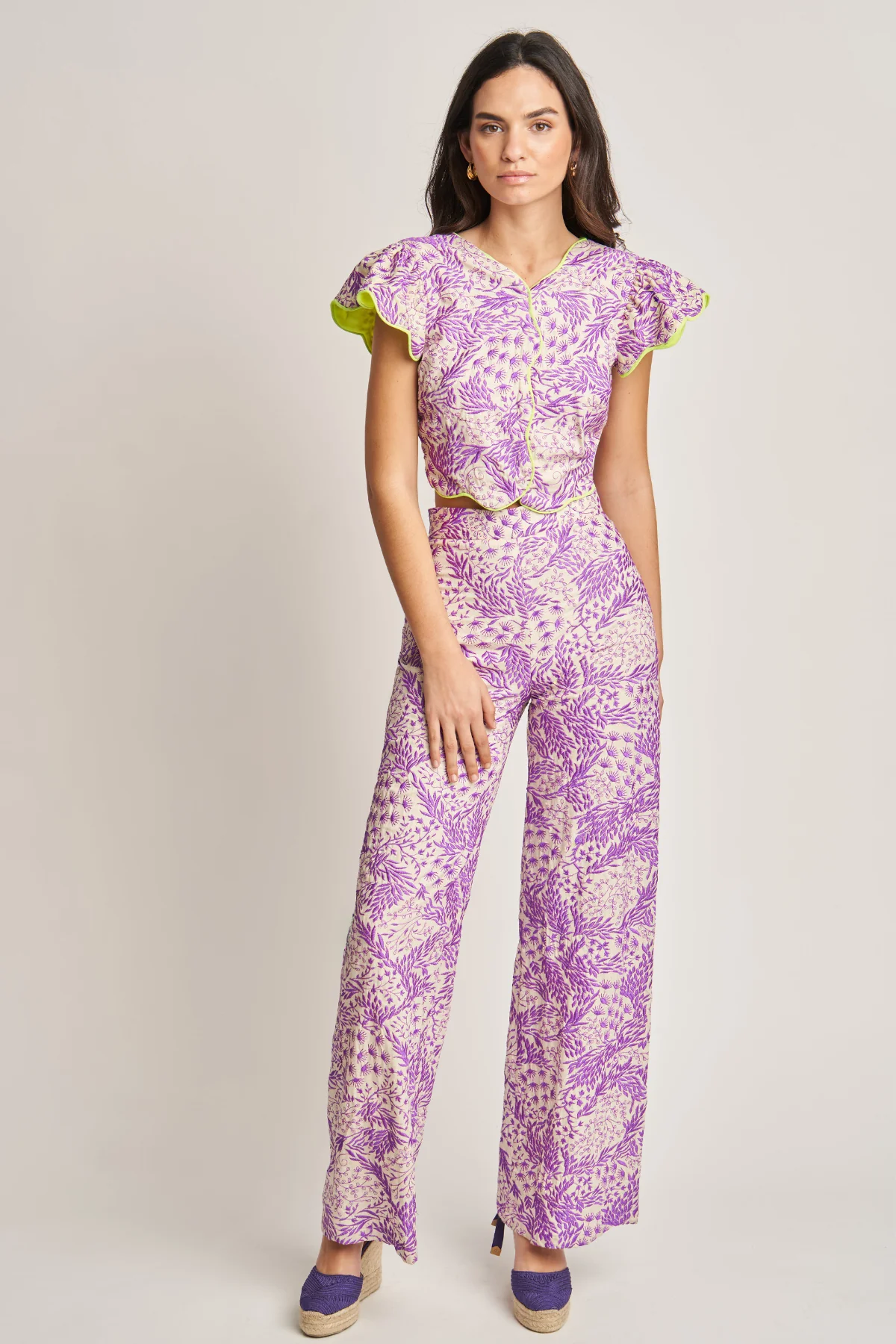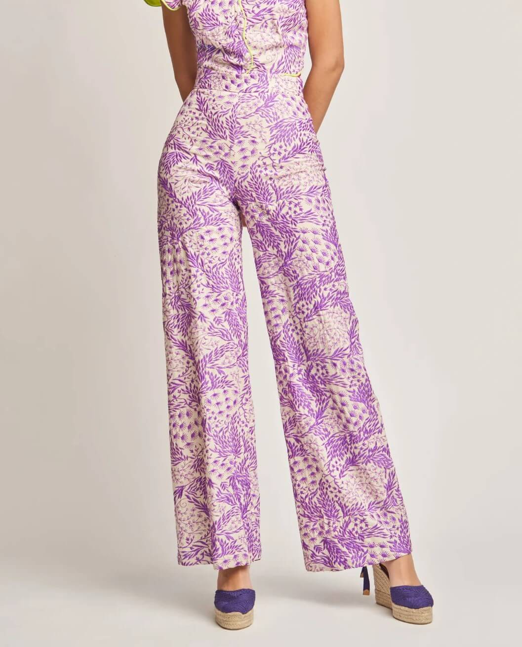 Pantalón confeccionado en tejido bordado floral en tonos lila sobre fondo crudo. Cintura alta y corte recto con ligera amplitud en la pernera. Cierre mediante cremallera.