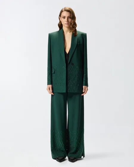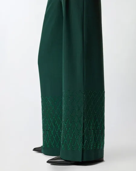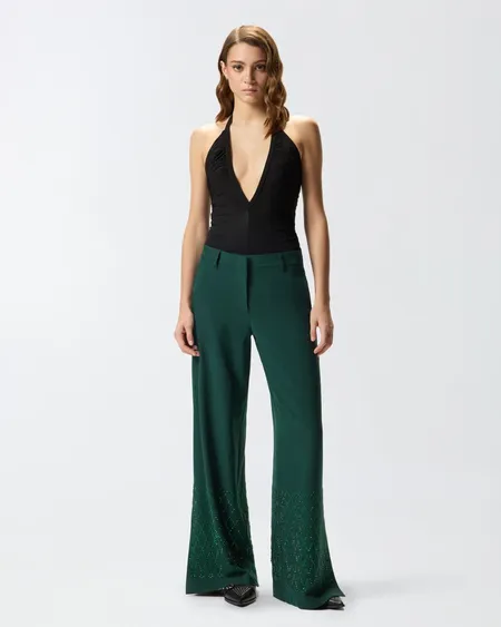 Pantalón largo de corte holgado con abertura en el bajo y bolsillos traseros de ribete. El modelo presenta una aplicación de strass de diferentes tamaños y formas que crea un sofisticado dibujo geométrico en la parte inferior. El diseño confiere a la prenda un efecto luminoso y precioso que realza la sencillez del modelo. Opta por un look total brillante y refinado con la chaqueta a juego para las ocasiones más especiales.