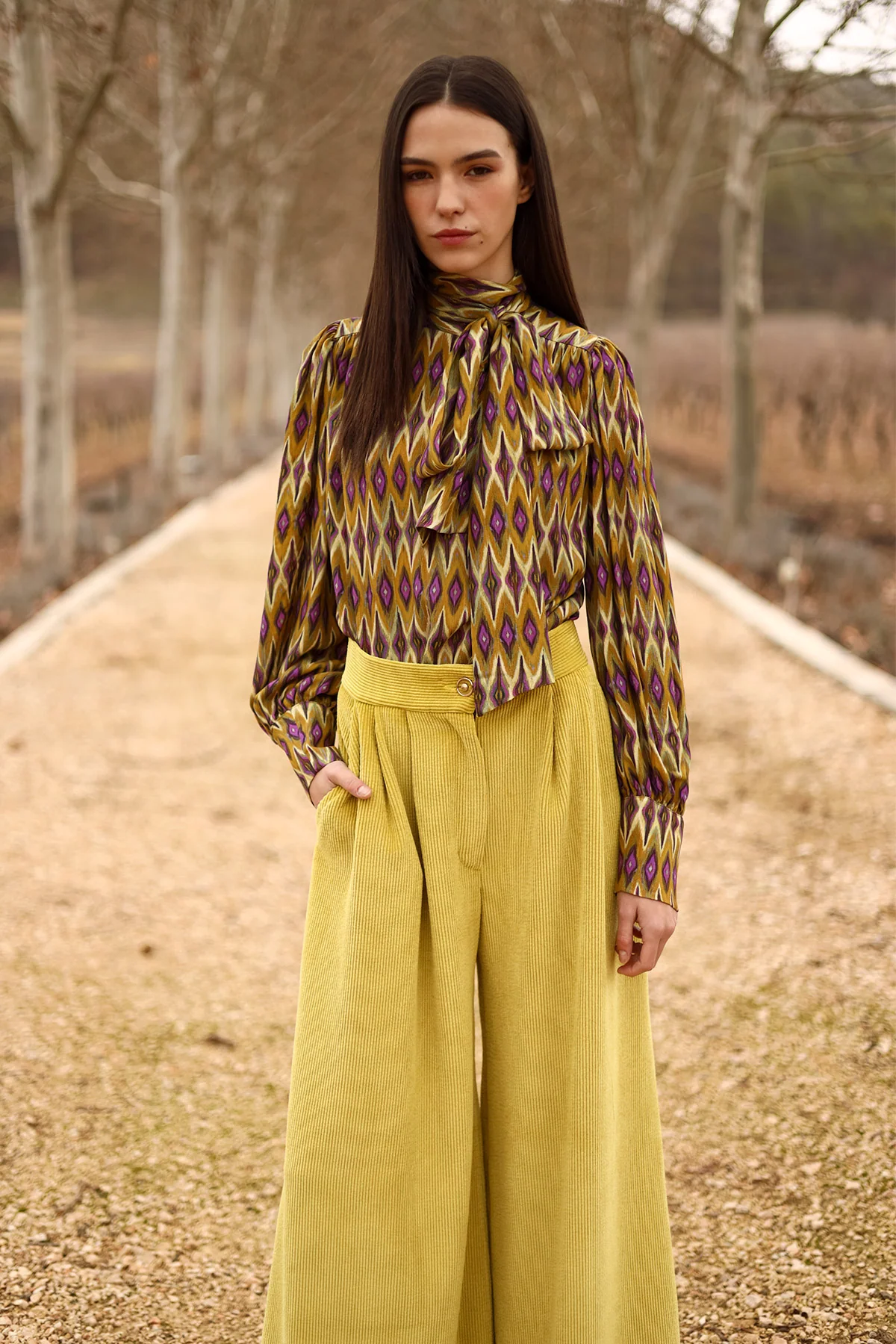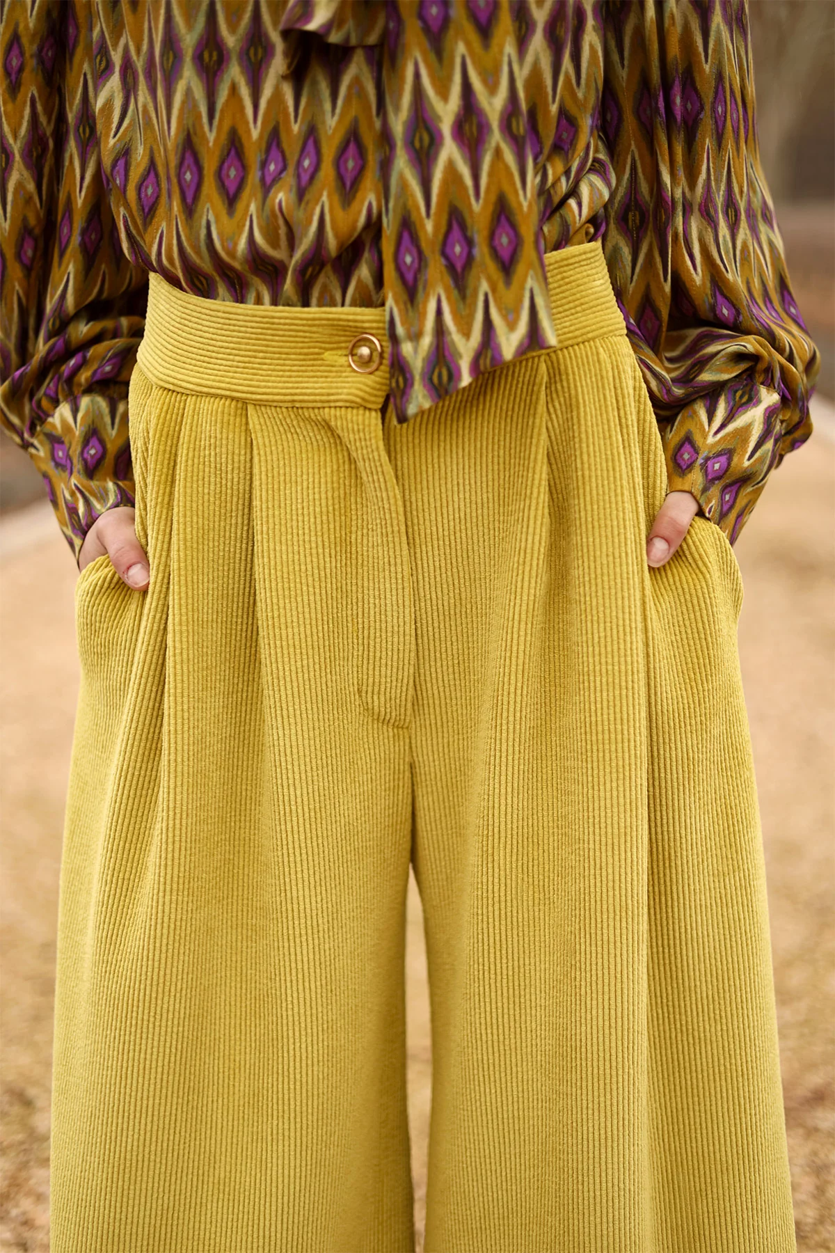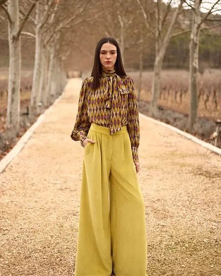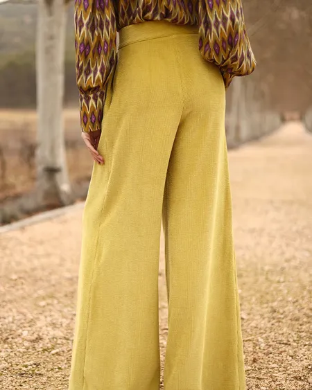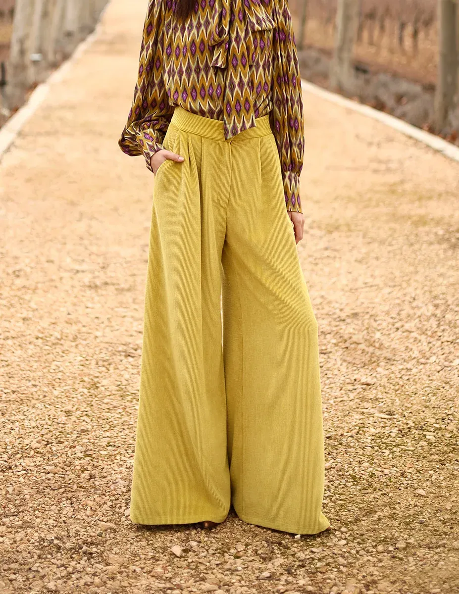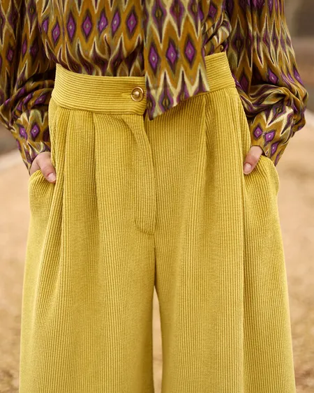 El pantalón Rute destaca por su corte amplio y fluido, que brinda una silueta sofisticada y favorecedora. Confeccionado en pana de alta calidad, su textura suave y cálida lo convierte en una prenda ideal para los meses más frescos.