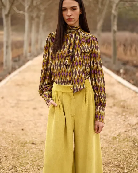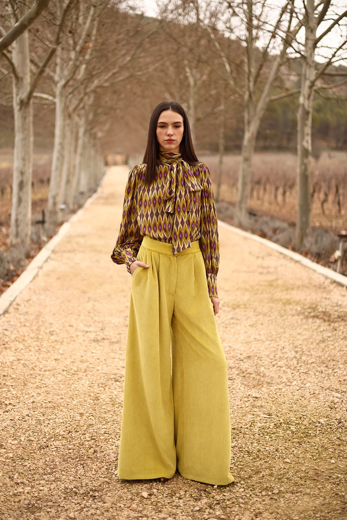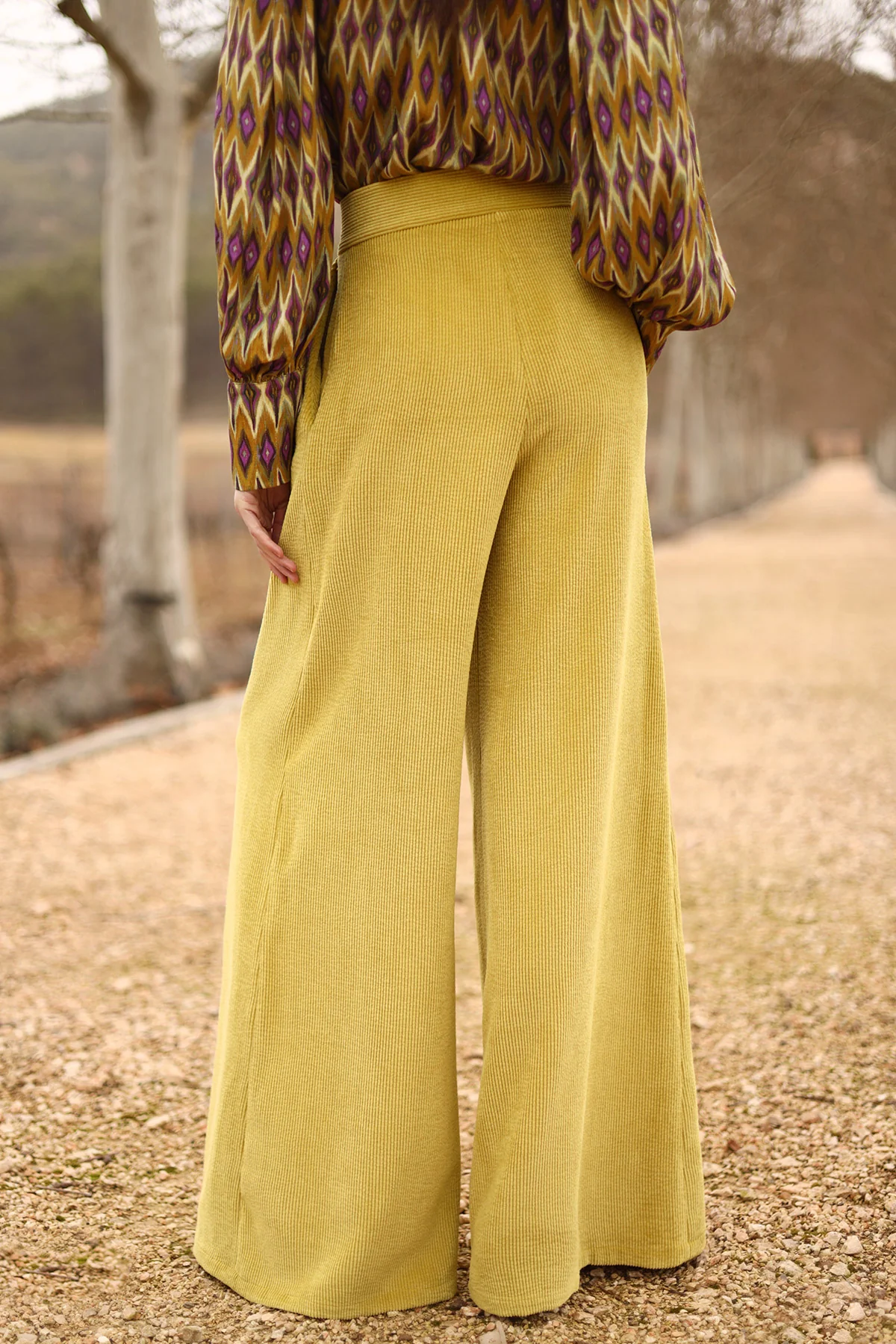 Su diseño de talle alto con pinzas frontales estiliza la figura, mientras que los bolsillos laterales aportan funcionalidad sin sacrificar elegancia. El tono lima aporta un toque de color sutil pero vibrante, ideal para combinar con blusas estampadas o prendas neutras. Una pieza versátil que une comodidad, estilo y carácter retro en un solo diseño.