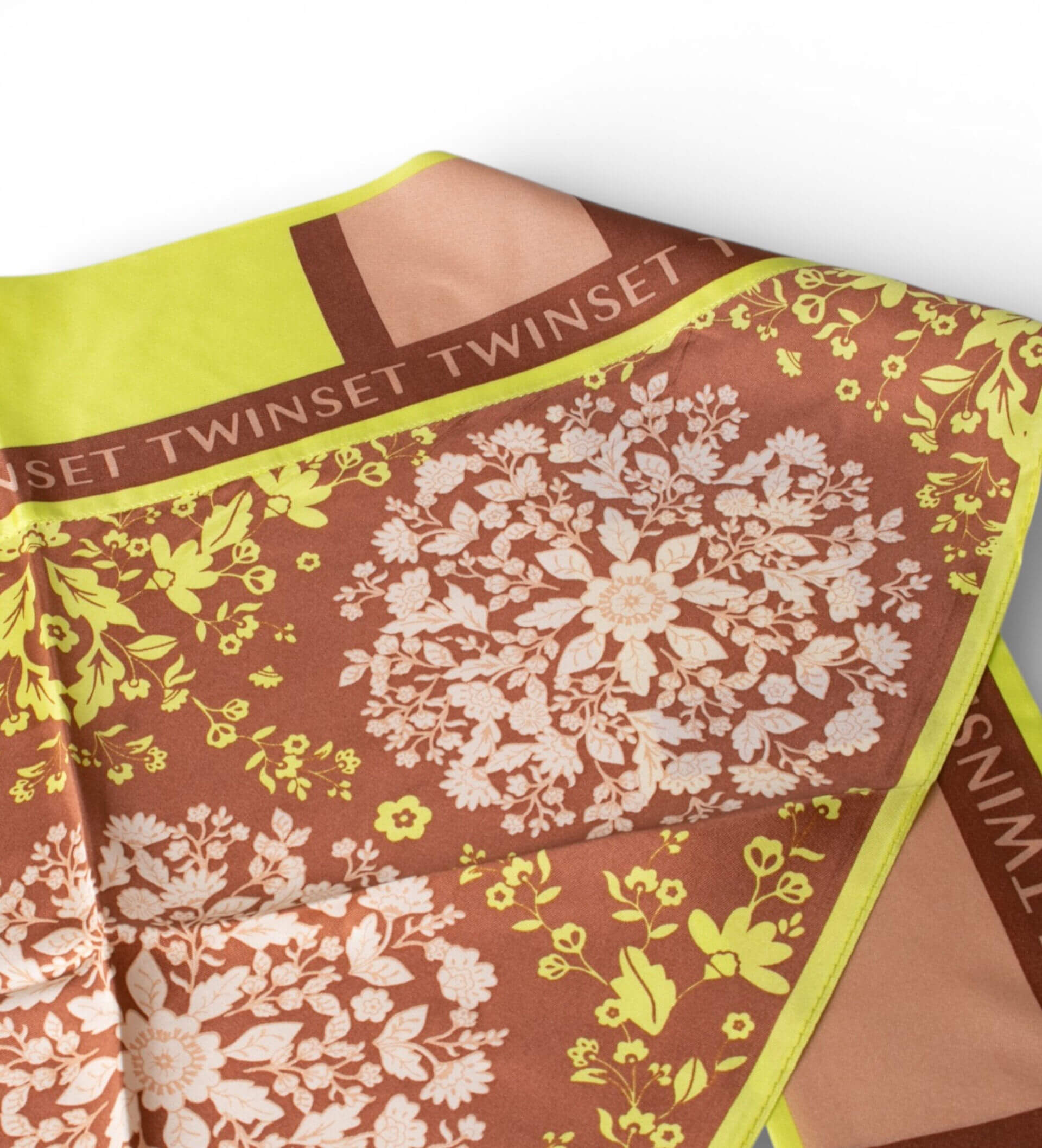 Pañuelo cuadrado con estampado floral en tonos marrones y blancos, enmarcado por un llamativo borde en amarillo lima. Un accesorio versátil que transforma cualquier look al instante, ya sea anudado al cuello, al bolso o al cabello.