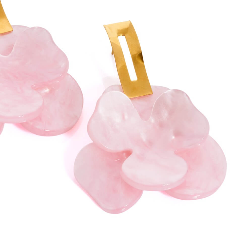 Pendiente con base dorada de forma rectangular y piezas de resina en forma de flor – pétalos.