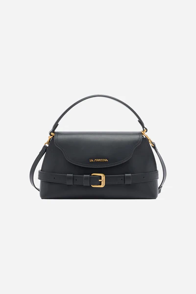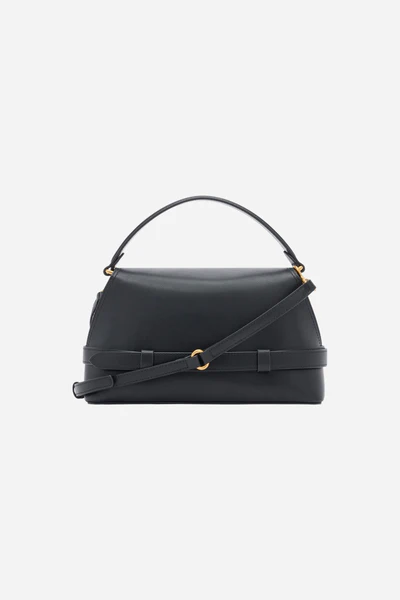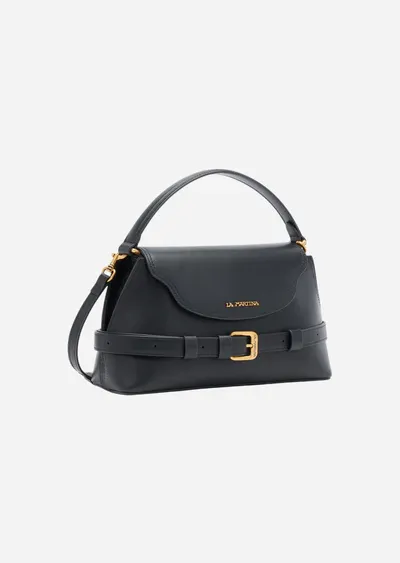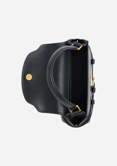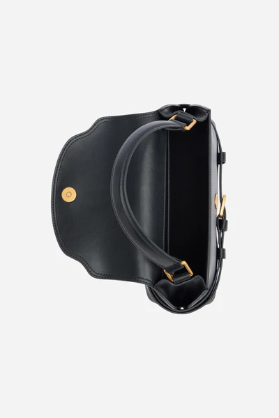 Bolso tote trapezoidal pequeño en piel de ternera, elegante y compacto, con cierre de solapa, asa rígida y correa desmontable. La hebilla dorada y la placa con logotipo en el frente refuerzan su carácter refinado.
