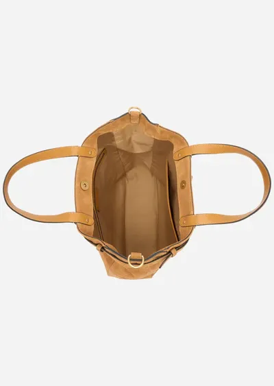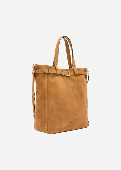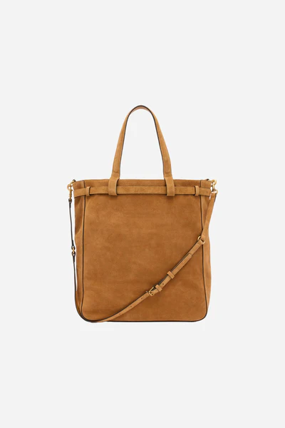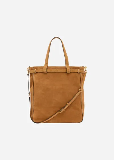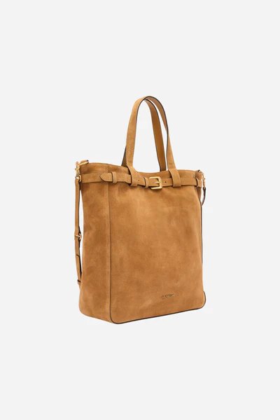 Bolso shopping confeccionado en suave piel de ante de tacto aterciopelado. Silueta rectangular mediana con asas superiores y correa desmontable y ajustable. El cinturón superior con hebilla integra las asas y aporta un detalle distintivo. Interior forrado en algodón con bolsillo interior con cremallera. Logotipo metálico en relieve sobre la hebilla frontal.