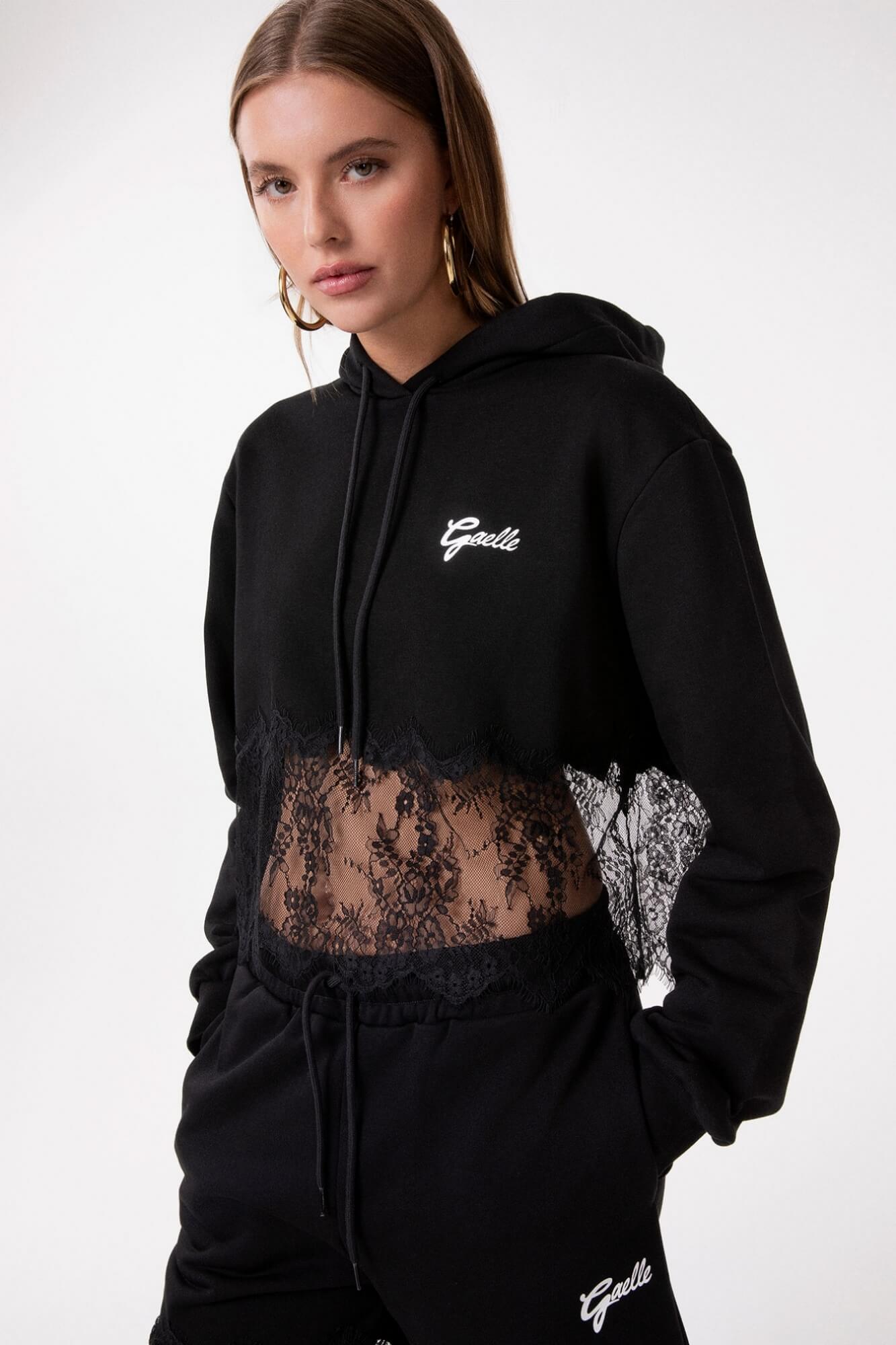 Etiquetas capucha, corta, encaje, gaële, negra, sudadera