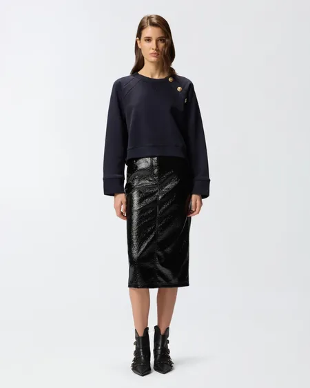 Sudadera de algodón con manga larga raglán e inserción triangular en forma de V en el cuello redondo. El corte de los hombros está cerrado con botones metálicos decorados con estrellas. La parte posterior está rematada con un parche bordado con el logotipo Love Birds: un detalle personalizado al más puro estilo PINKO. Ponte esta prenda con tus vaqueros favoritos para conseguir un look informal y actual.