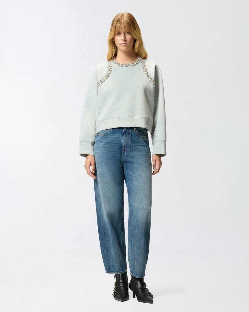 Sudadera informal de mujer confeccionada en punto acoplado de mezcla de algodón elástico, un tejido ligero y elástico con una superficie semibrillante. En la parte frontal del cuello y del corte raglán de las mangas hay una rica decoración de pedrería realizada a mano que se compone de cristales de diferentes formas y tamaños y de perlas irregulares de aspecto natural. Llévala con tus vaqueros favoritos para lucir un estilismo femenino y brillante.