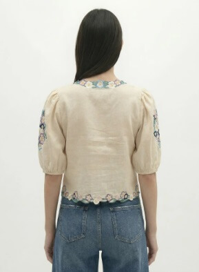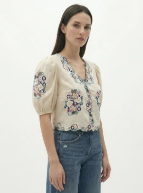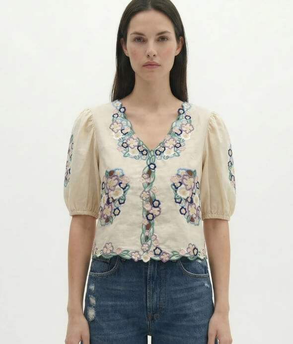 Este top de manga corta con escote en V combina comodidad y feminidad gracias a su bordado de grandes flores, aportando un toque vivo y original. Combínalo con vaqueros rectos o shorts fluidos para un look veraniego chic y colorido.