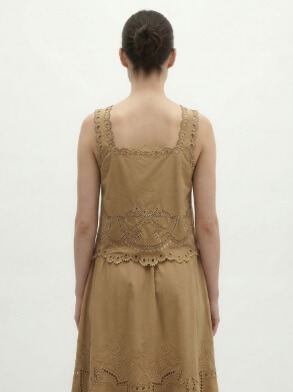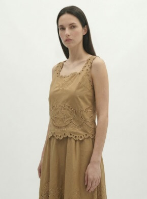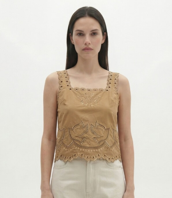 Este top camel de tirantes combina feminidad y ligereza gracias a sus delicados bordados ingleses y volantes en los hombros, que aportan un toque refinado. Combínalo con shorts fluidos o vaqueros de talle alto para un look veraniego chic y moderno.