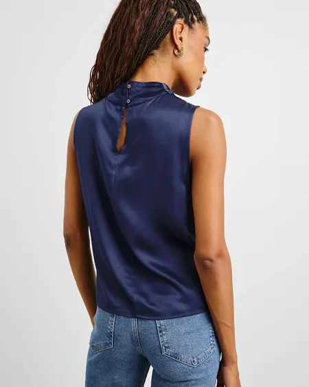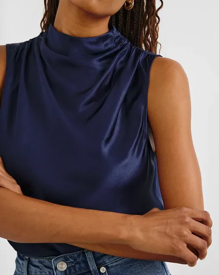El top Kaleen es una camiseta de tirantes contemporánea confeccionada en crepé suave con espalda de satén. Presenta un cuello alto drapeado y una silueta fluida con un corte camisola tradicional.