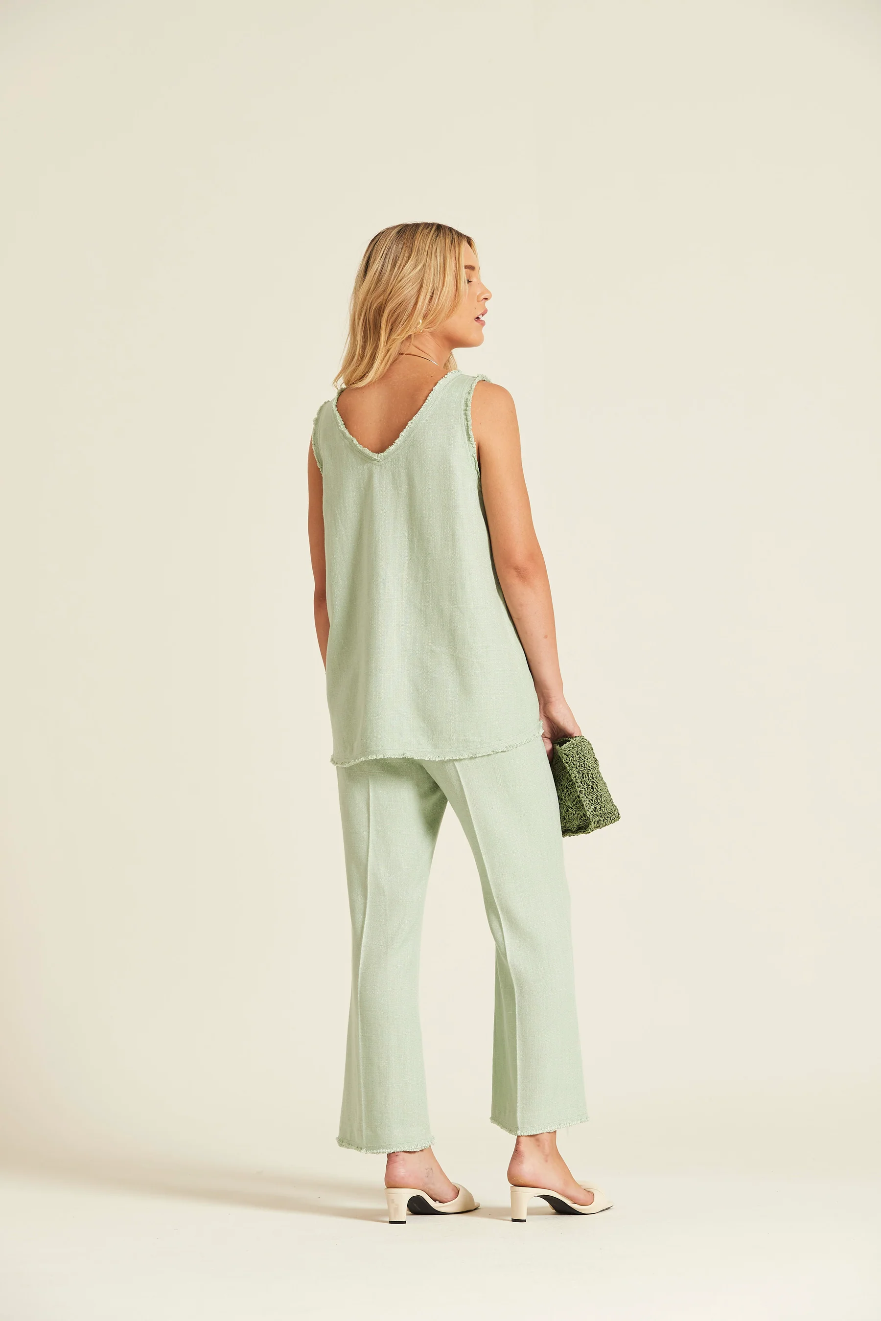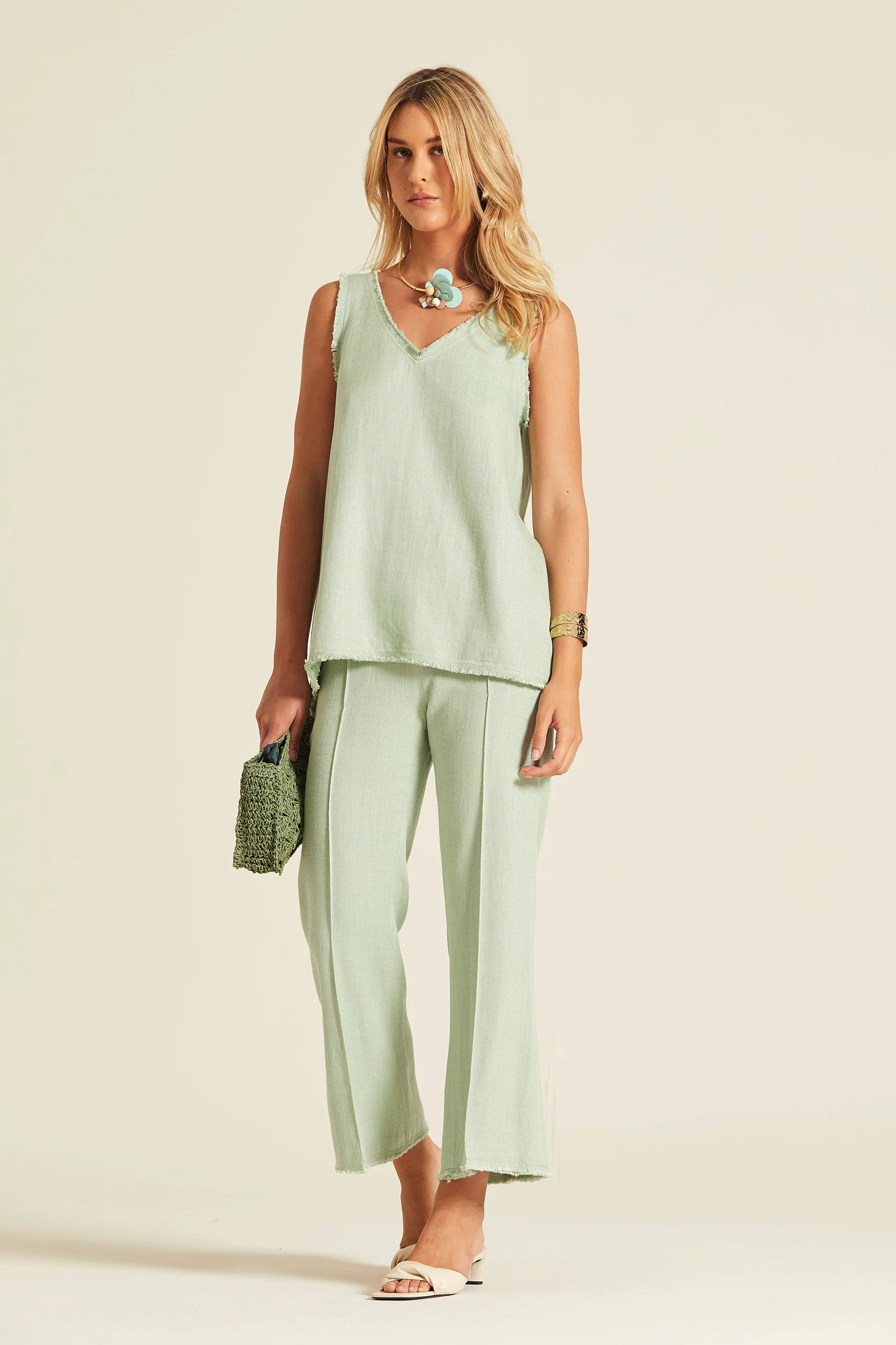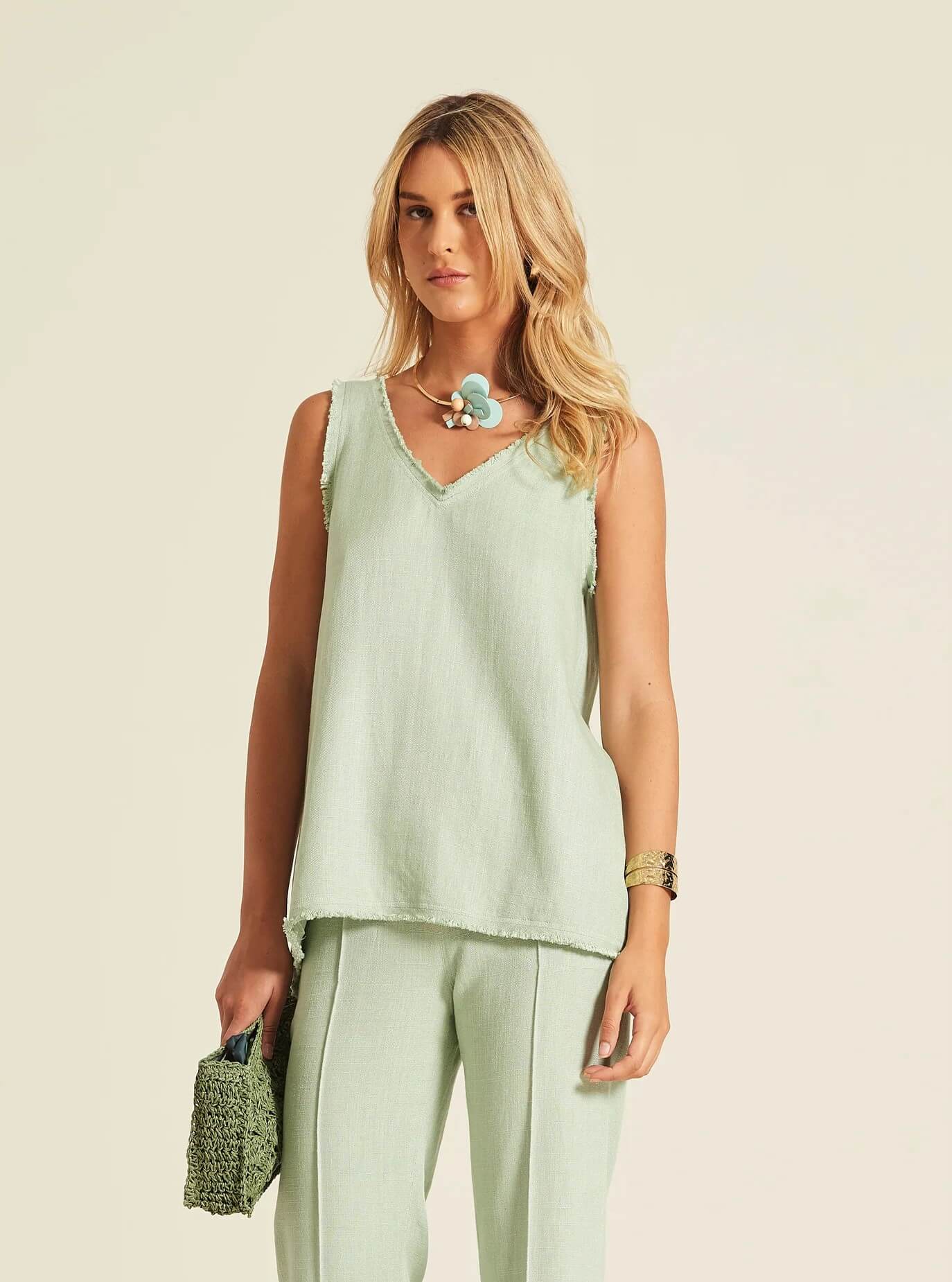 Top de tirante ancho confeccionado en tejido de lino rústico de textura natural. Presenta un diseño de corte relajado con escote en pico y acabados desflecados que aportan un aire artesanal y fresco.