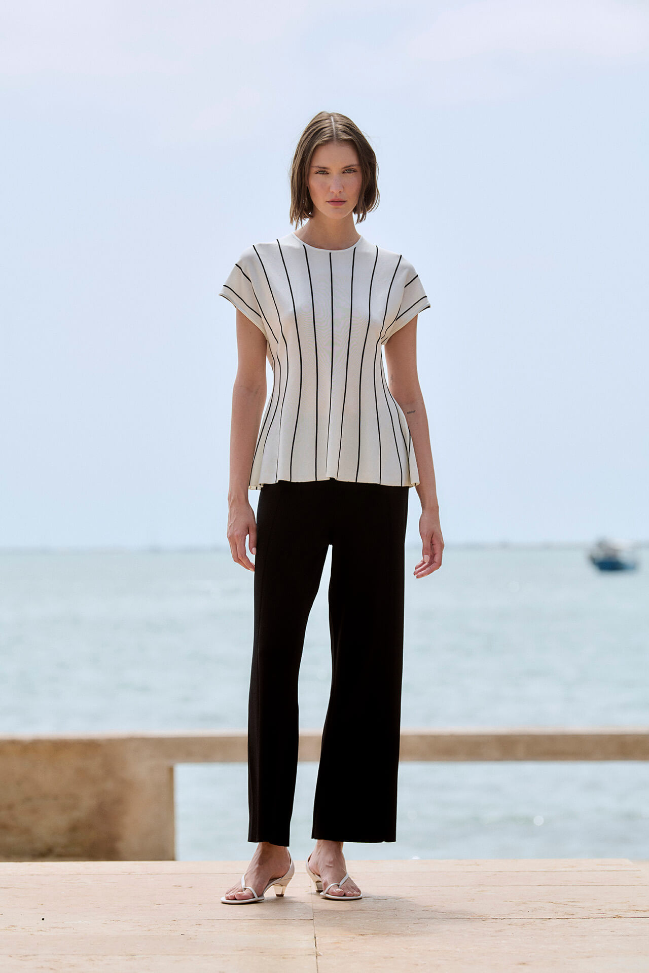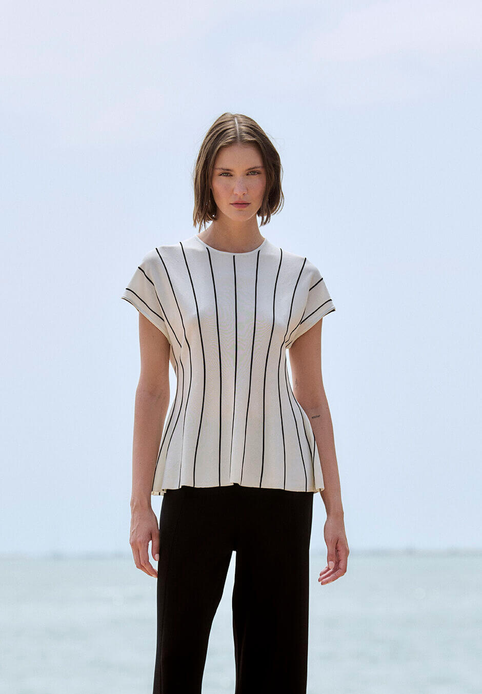 Top con rayas verticales, realizado con técnica radial con efecto peplum. Silueta definida y volumen sutil.