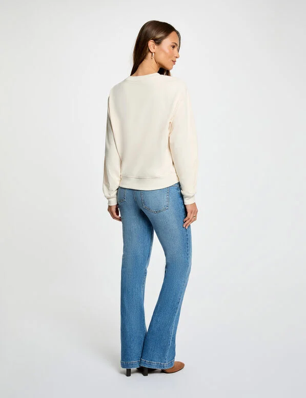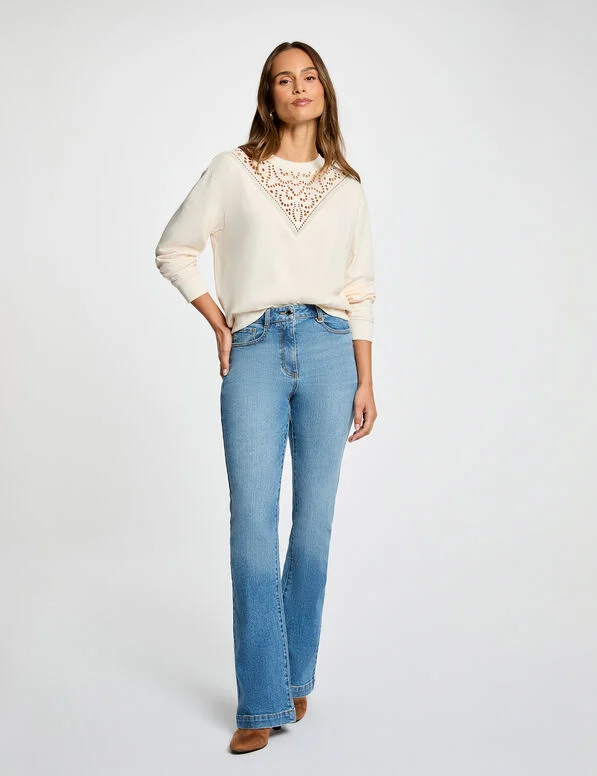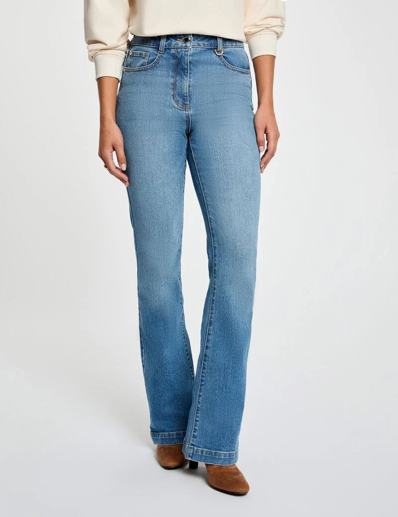 - Este vaquero de corte bootcut alarga sutilmente la silueta mientras resalta con elegancia la cintura. Su estilo casual chic encarna perfectamente el espíritu moderno y de tendencia, convirtiéndolo en un verdadero imprescindible. Una prenda atemporal que se integra fácilmente en todos los guardarropas femeninos.
