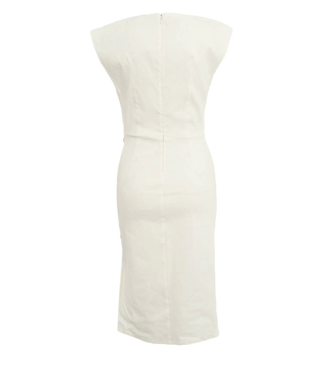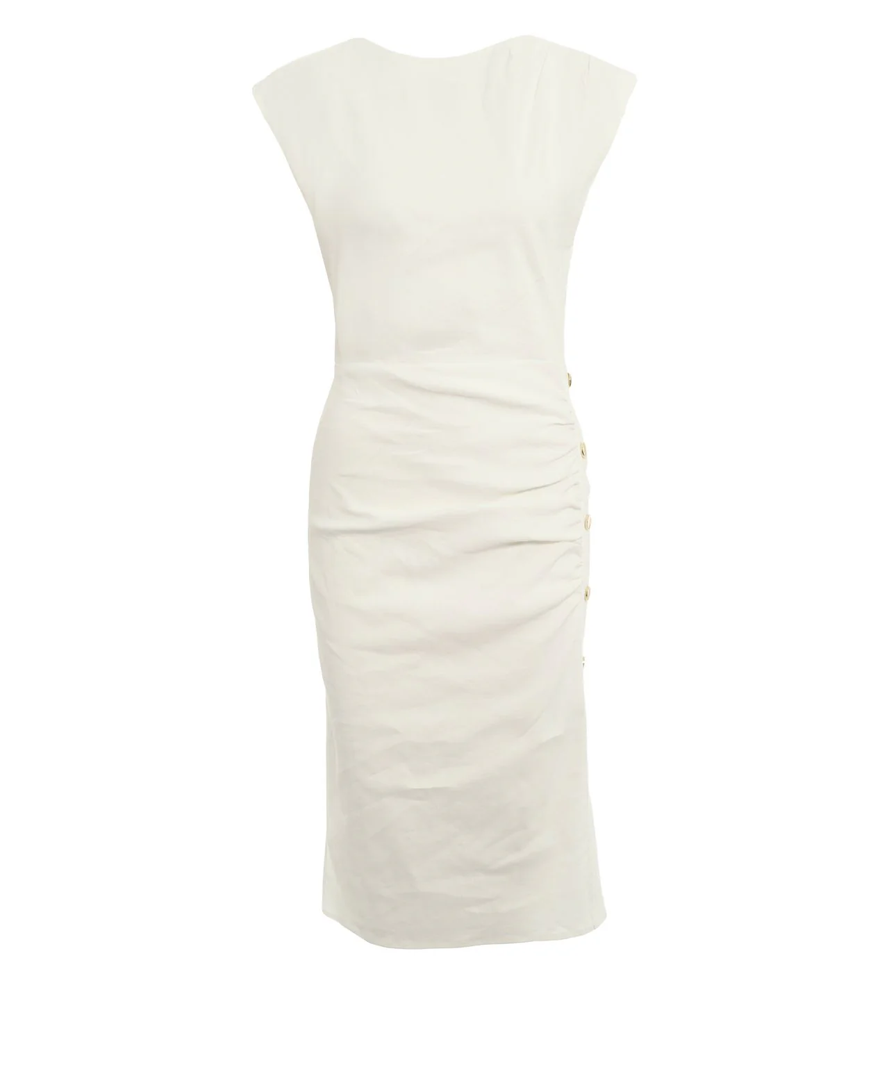 Vestido «longuette» caracterizado por una parte superior con cuello redondo y mangas casquillo apenas insinuadas y por una falda ceñida, animada por delicados drapeados en la parte delantera. Confeccionado en mezcla de lino y viscosa elástica de ligamento tafetán, un tejido flameado y luminoso que reinterpreta de forma innovadora el lino clásico, el modelo se completa con un cómodo cierre con cremallera invisible en la parte trasera, que resulta práctico y mantiene el diseño sencillo, y una pequeña abertura en el lateral decorada con aplicaciones metálicas. El diseño atemporal estilo tubo y el tejido veraniego hacen de este vestido de PINKO la elección ideal para dar vida a looks refinados y siempre especiales para llevar tanto de día como de noche.