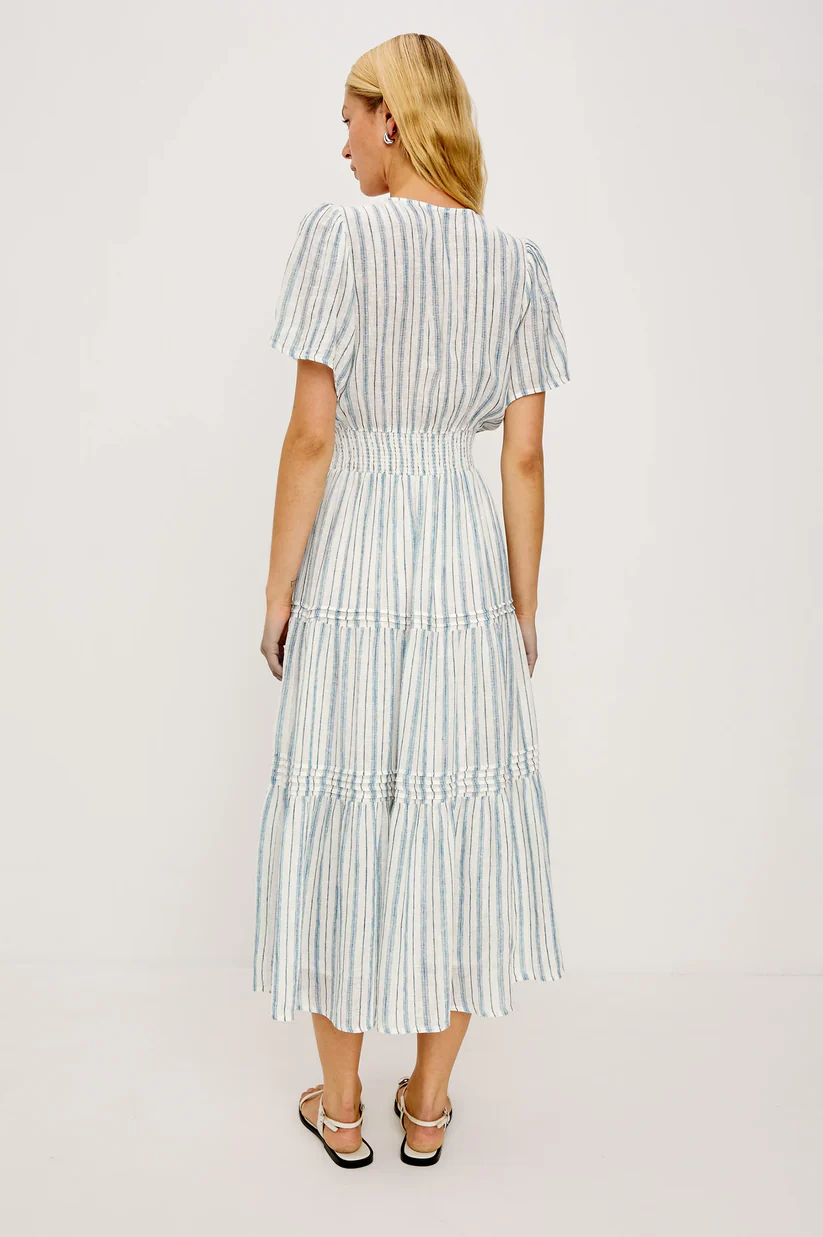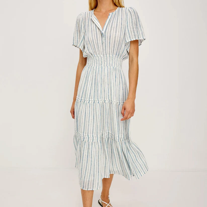 Un lujoso vestido de lino inspirado en las escapadas a la Riviera Francesa. El modelo Cannes es un clásico cómodo con escote de media tapeta, mangas cortas anchas, cintura fruncida y falda midi escalonada.