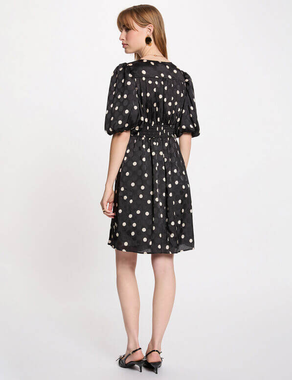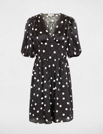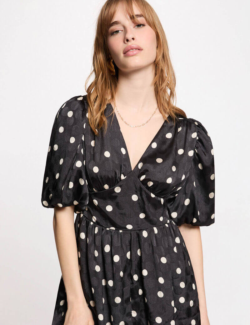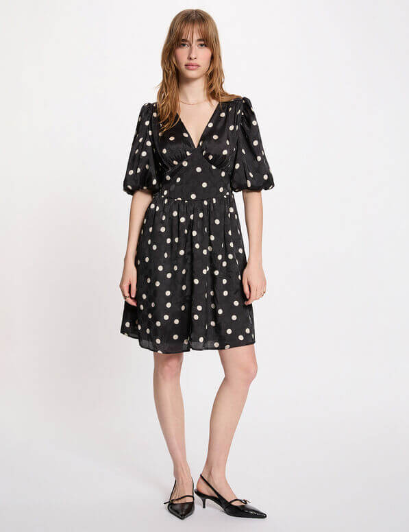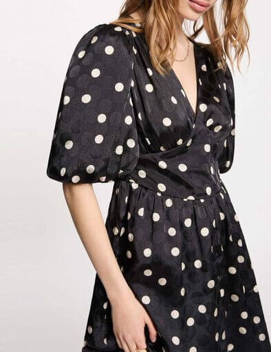 - Esta corta vestido seduce por su estampado de lunares, que aporta un encanto retro decididamente de moda. Las mangas abullonadas añaden un toque femenino y sofisticado, mientras que su corte fluido realza la silueta con ligereza. Ideal para realzar las piernas, encarna la elegancia moderna en toda su simplicidad.