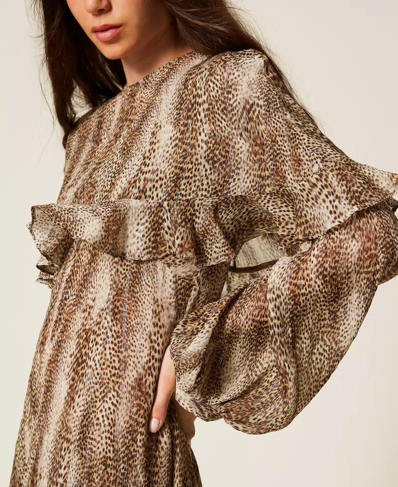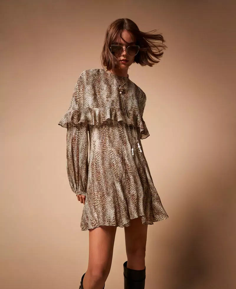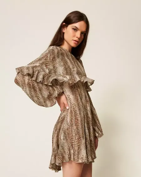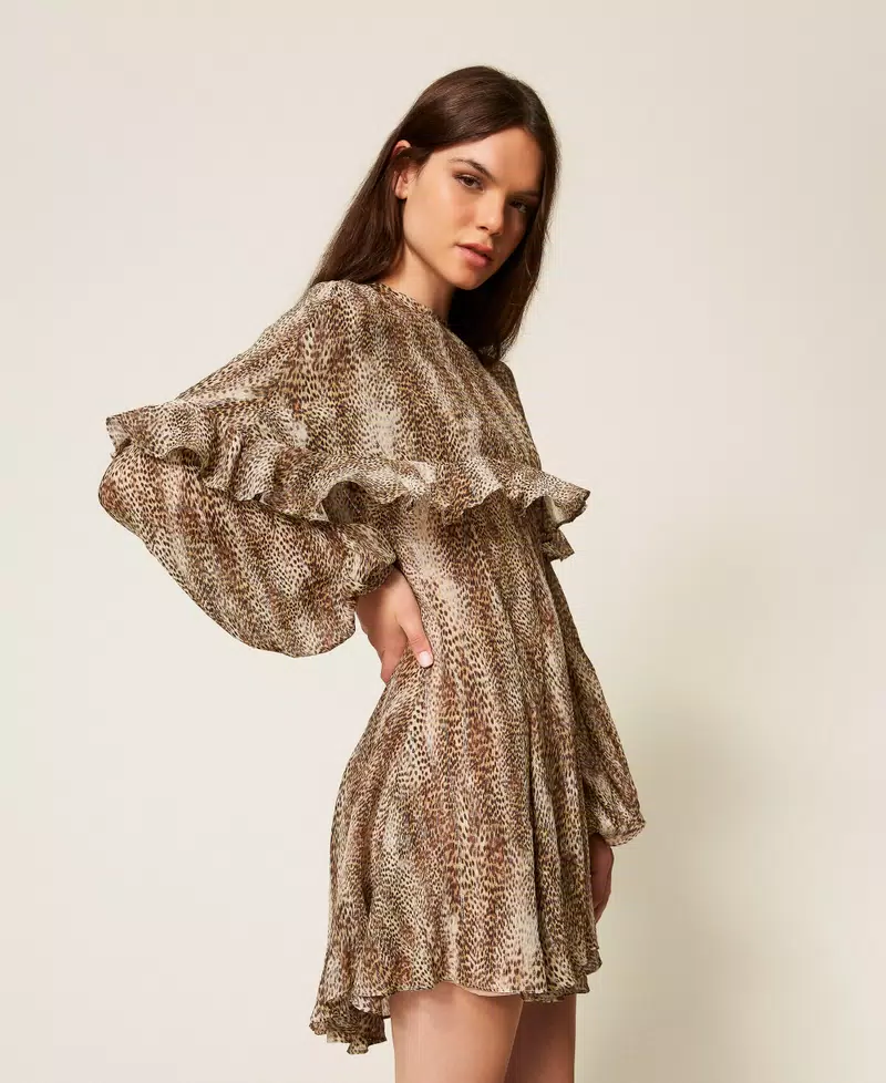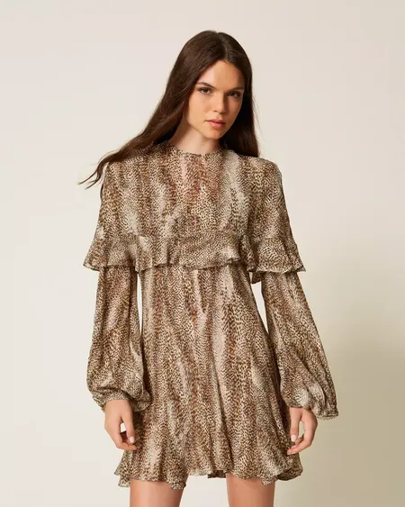 Vestido corto de crepé de viscosa y seda con lúrex de estampado animal print combinado con una capa extraíble. Presenta un escote de pico, manga larga con puño y botón, cierre de cremallera en la parte trasera, combinación a juego y corte holgado.