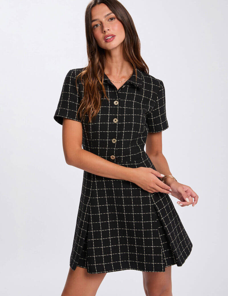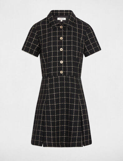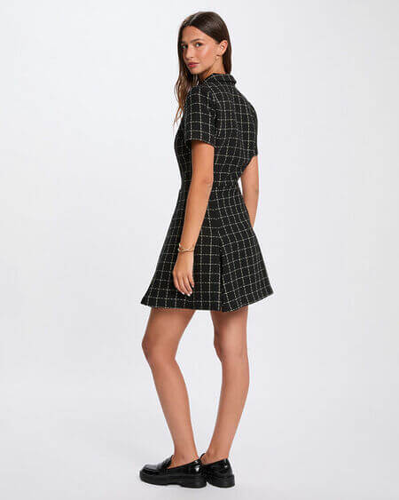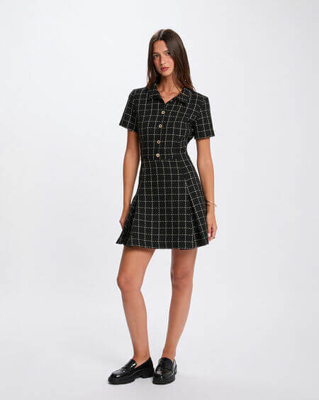 - Esta vestido ajustado de largo a la rodilla realza la silueta con elegancia. Su cuello con solapa aporta un toque sofisticado y femenino, mientras que los botones estructuran delicadamente el conjunto. El efecto tweed refuerza su estilo casual chic atemporal, ideal para un look moderno y refinado.