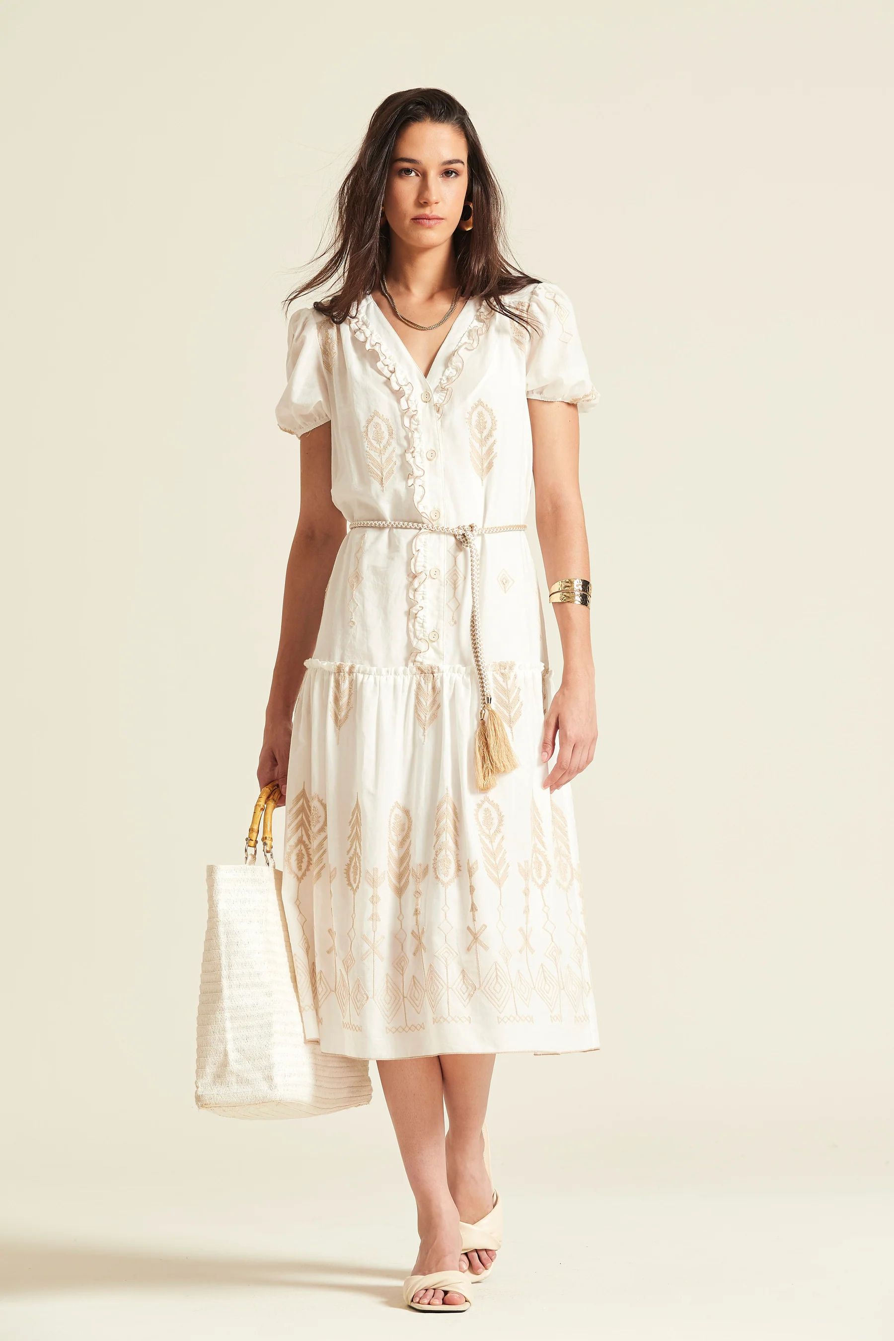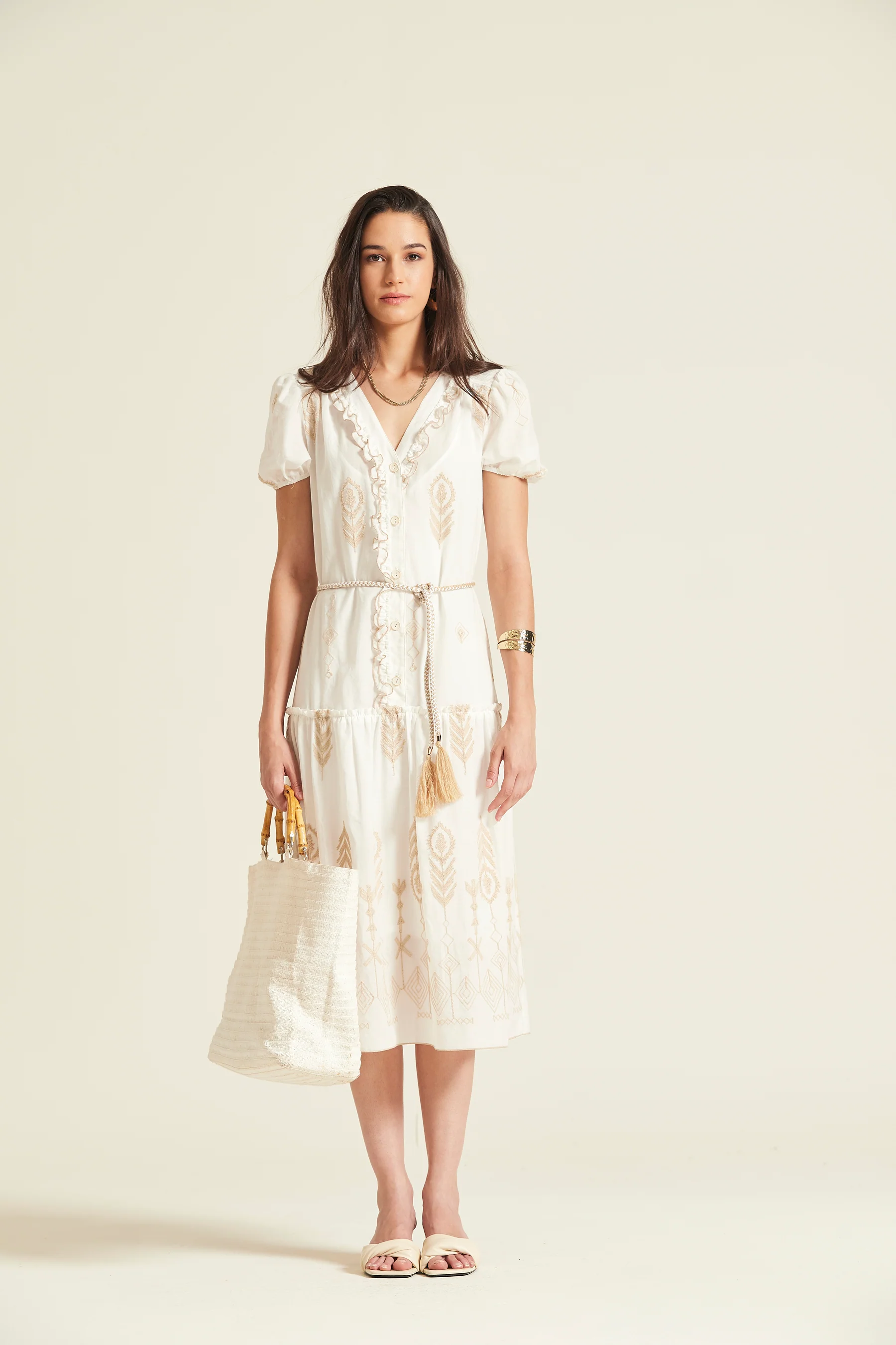 Vestido corto confeccionado en voile de algodón ligero en color crudo. Presenta un delicado bordado de inspiración étnica en tonos naturales, escote en V con detalles de minivolantes y unas románticas mangas cortas con acabado fruncido.