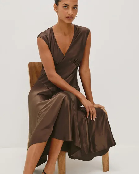 El vestido midi Eleni deslumbra en crepé satinado, con mangas cortas, elegantes detalles fruncidos y falda asimétrica.
