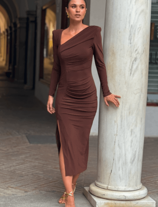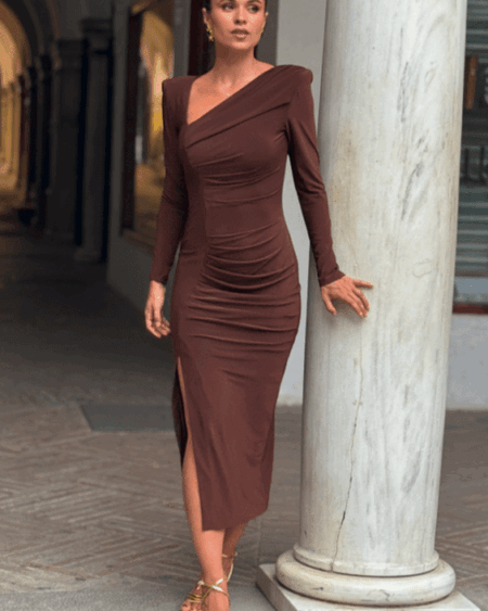 Vestido de largo midi en punto de seda color marrón. De manga larga, escote asimétrico y abertura lateral. Detalle drapeado en la parte delantera.