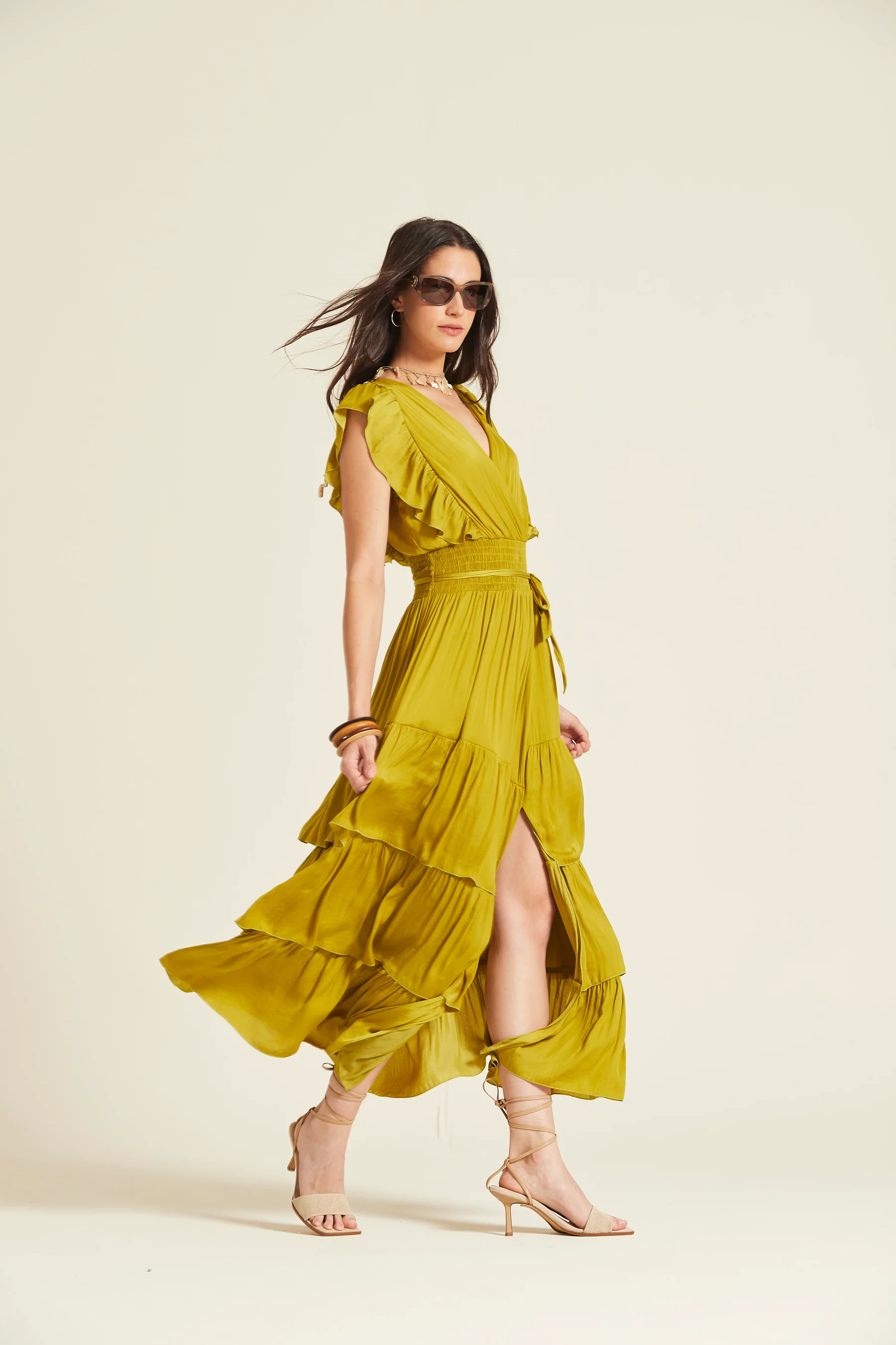 Vestido de tejido ligero y fluido en color mostaza. Presenta escote en V cruzado, cintura elástica tipo nido de abeja con lazo y falda larga con varios niveles de volantes.Un diseño cómodo y femenino ideal para el día a día o eventos relajados de verano.
