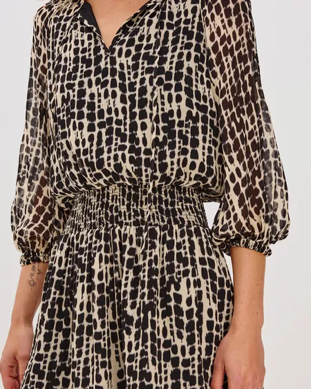 El Kari ofrece un corte favorecedor con una falda escalonada y detalles fruncidos en hombros y cintura. Un cierre de lazo en la parte delantera permite personalizar el escote.
