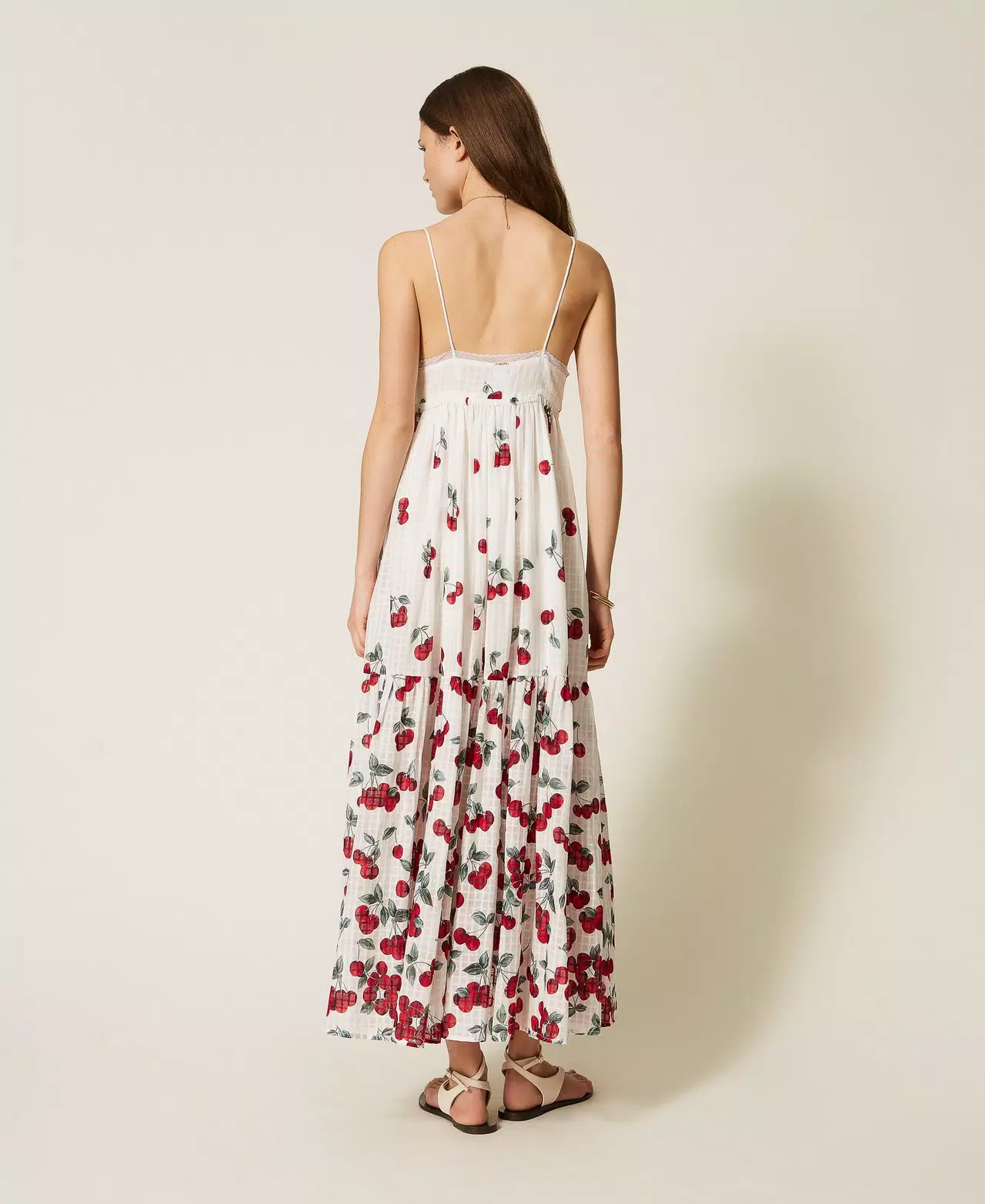 Vestido largo fabricado en Italia en algodón de jacquard de cuadros con estampado de cerezas posicionado en degradado, un diseño exclusivo de Twinset. Presenta tirantes finos, escote de pico, cierre de botones, corte imperio, falda ancha fruncida, volante en el bajo y corte holgado.
