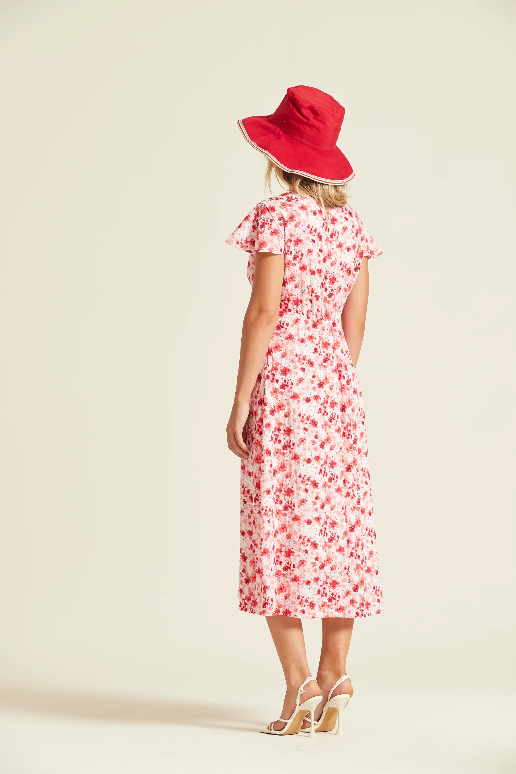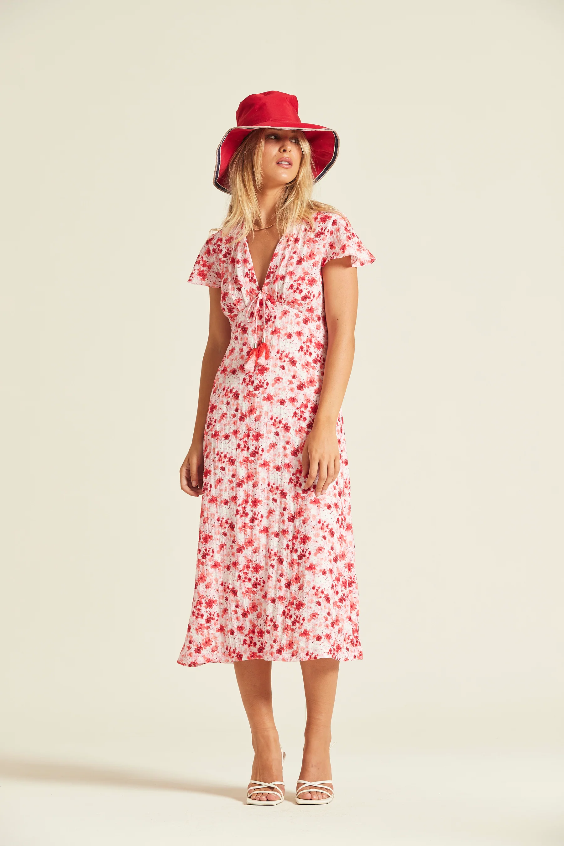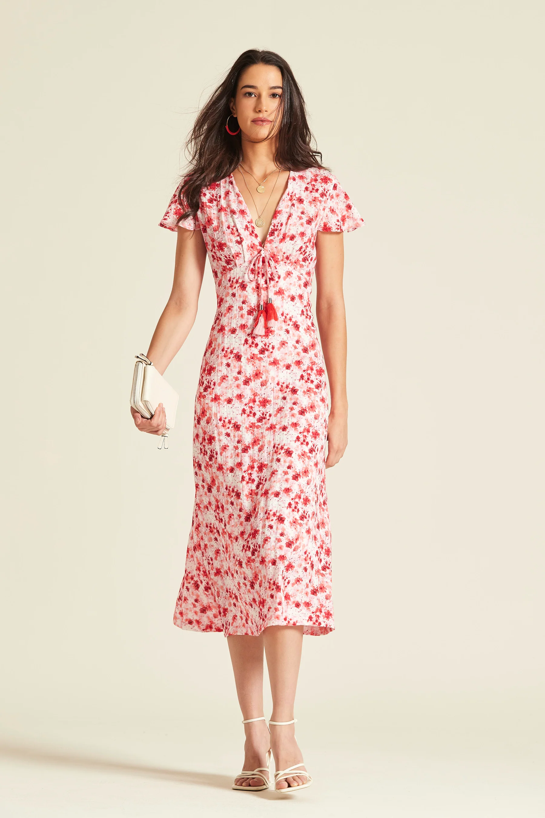 Vestido de largo midi confeccionado en viscosa de acabado rústico con un delicado estampado floral en tonos rojos sobre fondo crema. Presenta un favorecedor escote en “V” con detalle de lazada y borlas, manga corta con ligero vuelo y una silueta que se desliza suavemente sobre el cuerpo.