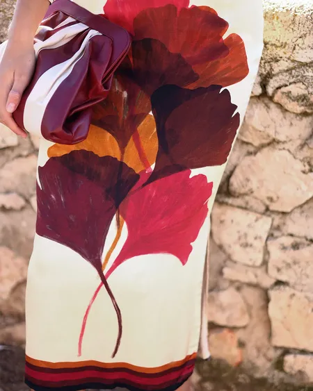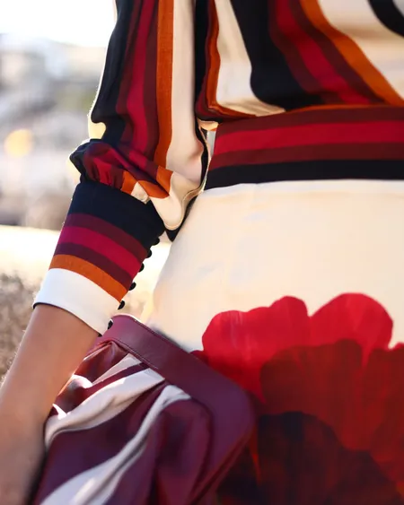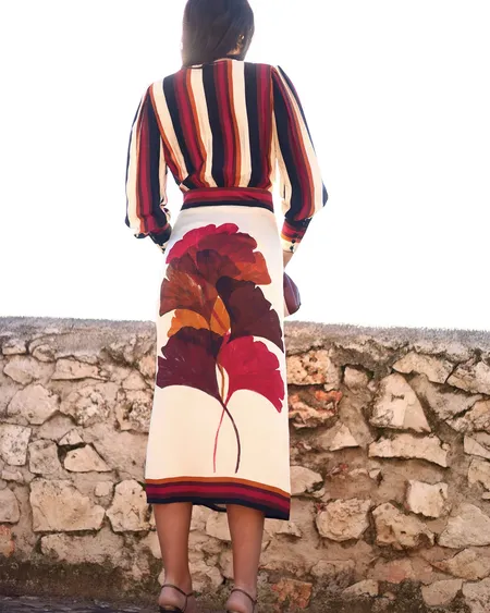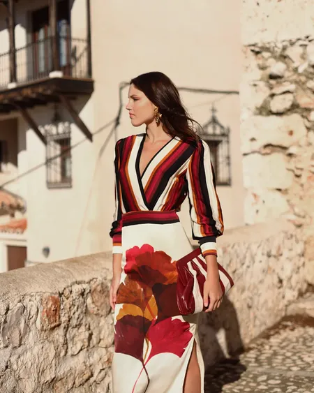 El vestido Poet es una oda al estilo contemporáneo con alma artística. Su diseño combina líneas verticales en tonos intensos , que estilizan la figura y evocan fuerza visual, mientras que la falda blanca se adorna con grandes pinceladas florales, como si fuera una obra de arte en movimiento. El escote cruzado y las mangas abullonadas aportan un aire romántico, equilibrando estructura y suavidad.