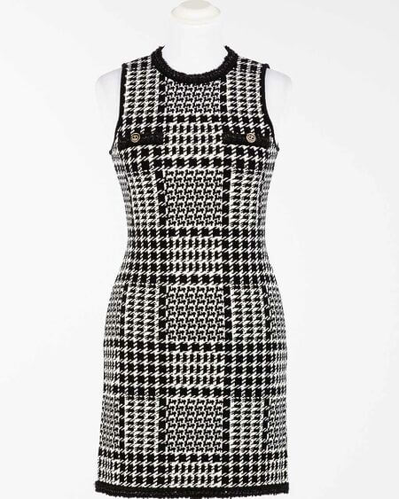 Vestido de punto con estampado de pata de gallo en diferentes tamaños. En color blanco y negro. Manga sisa y cuello redondo.