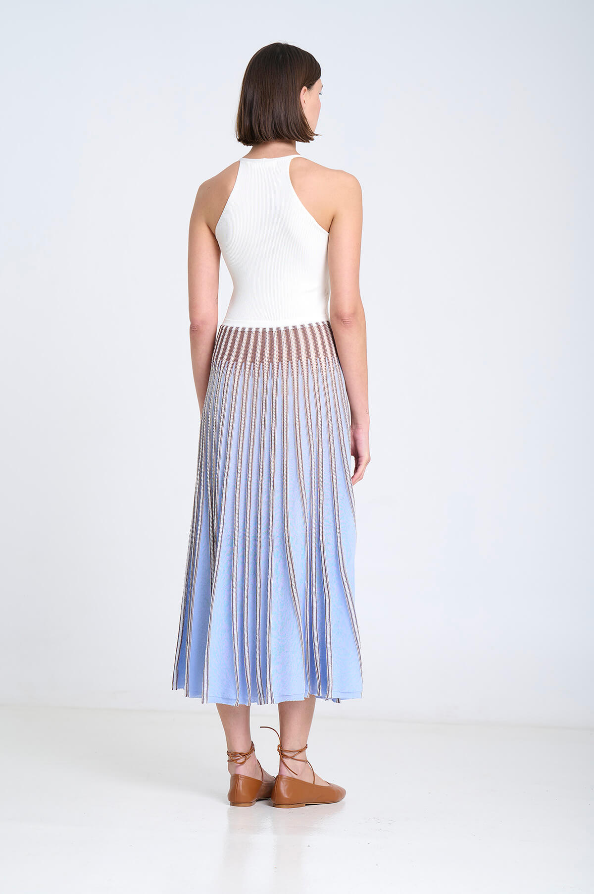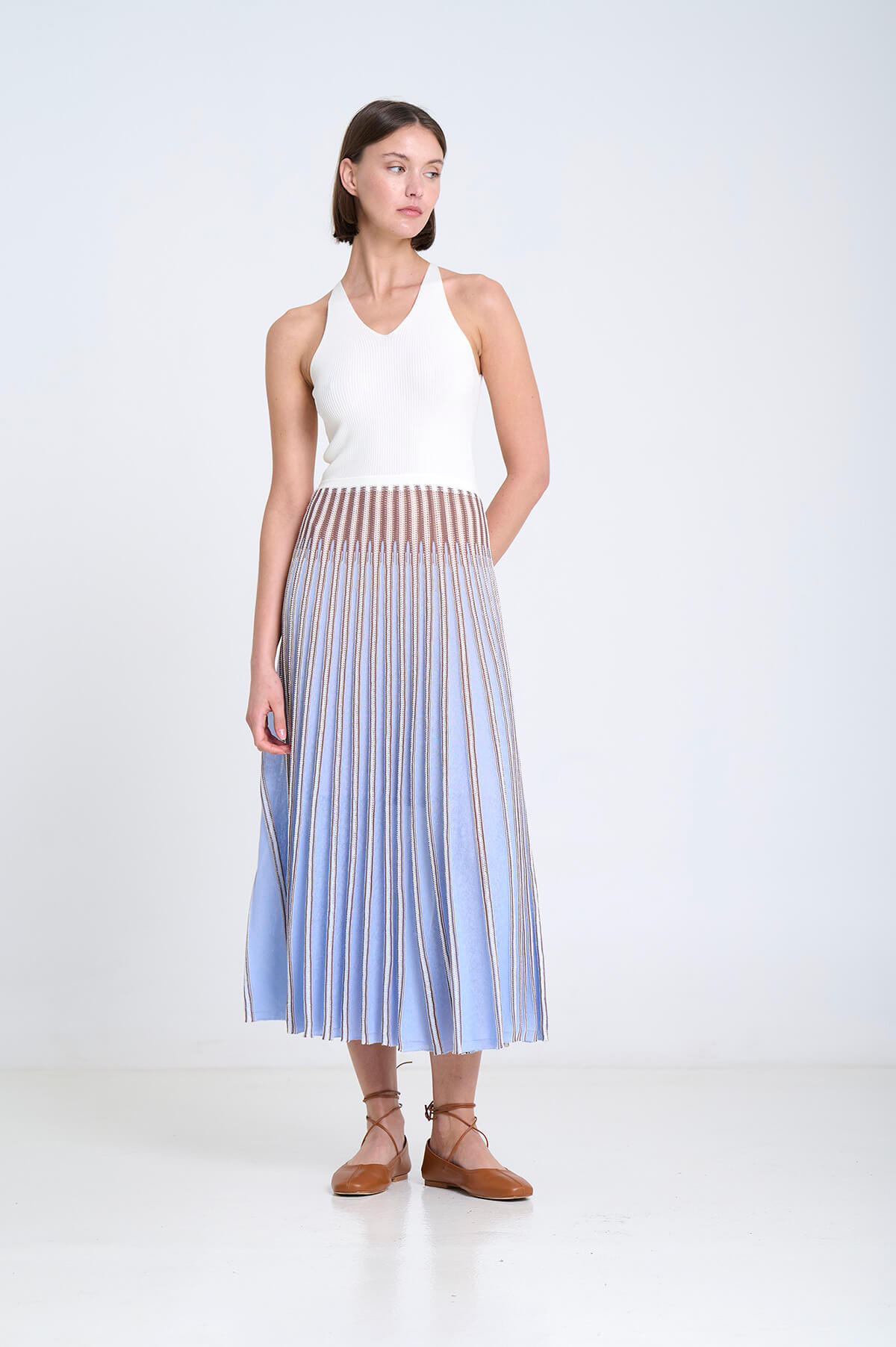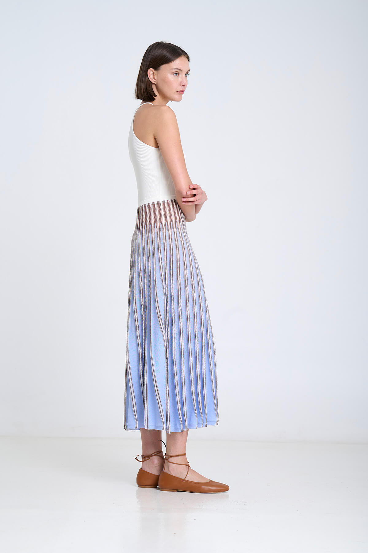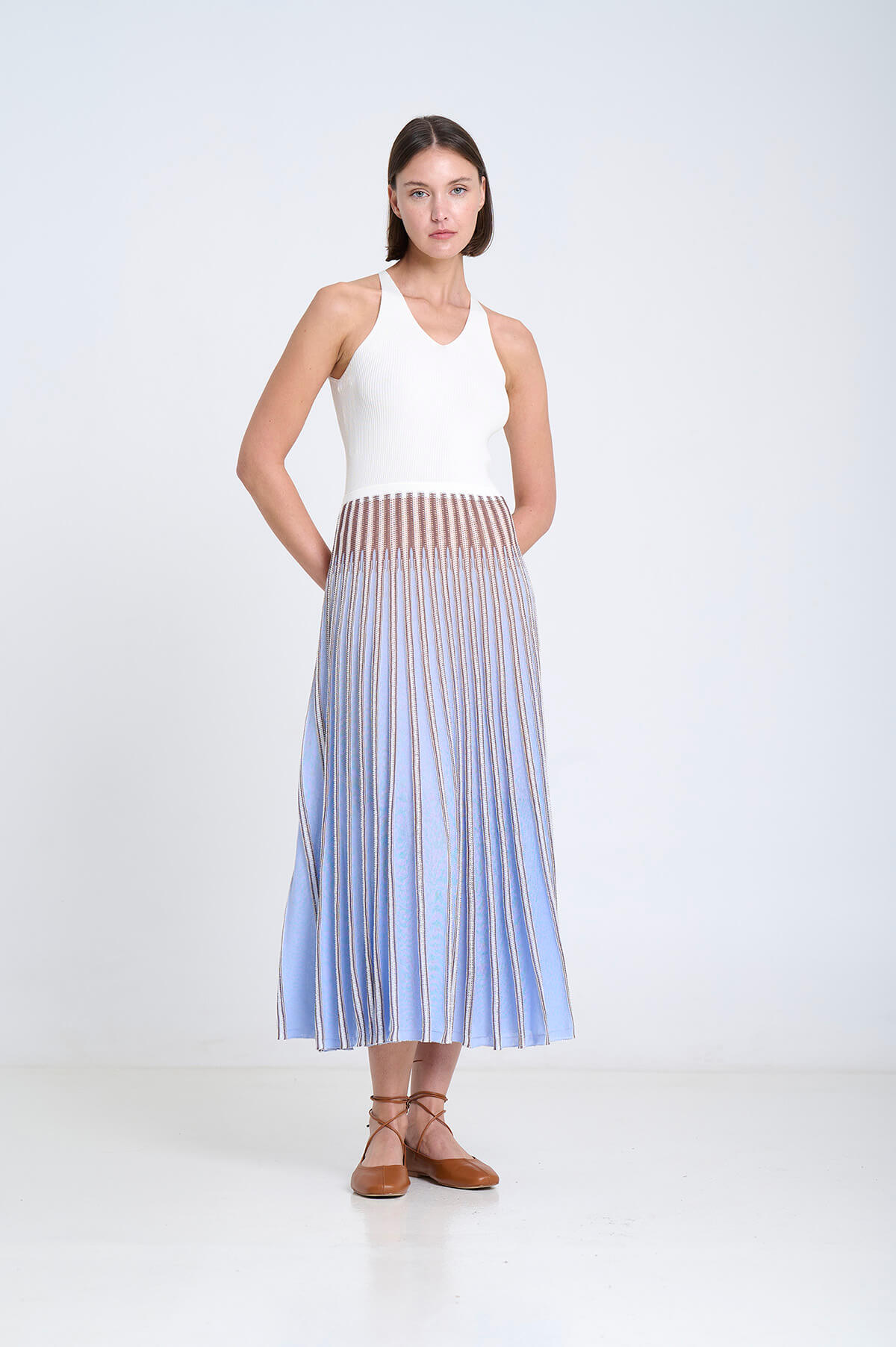 Vestido de punto con cuerpo acanalado ajustado y patrón halter con escote en pico. La parte de la falda es de punto radial a rayas con pequeños calados entre las franjas. La falda incluye forro fijado a la cintura en color nude.