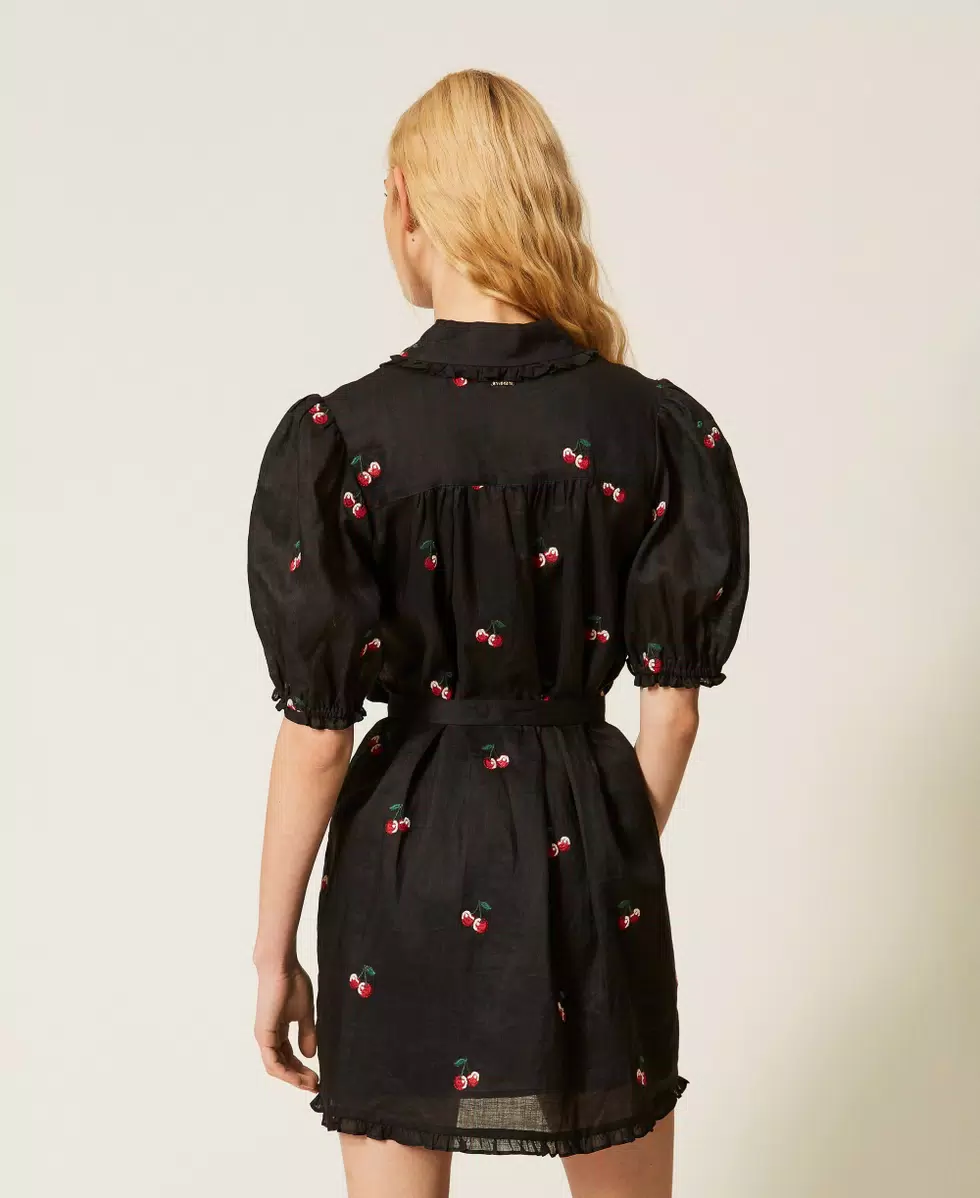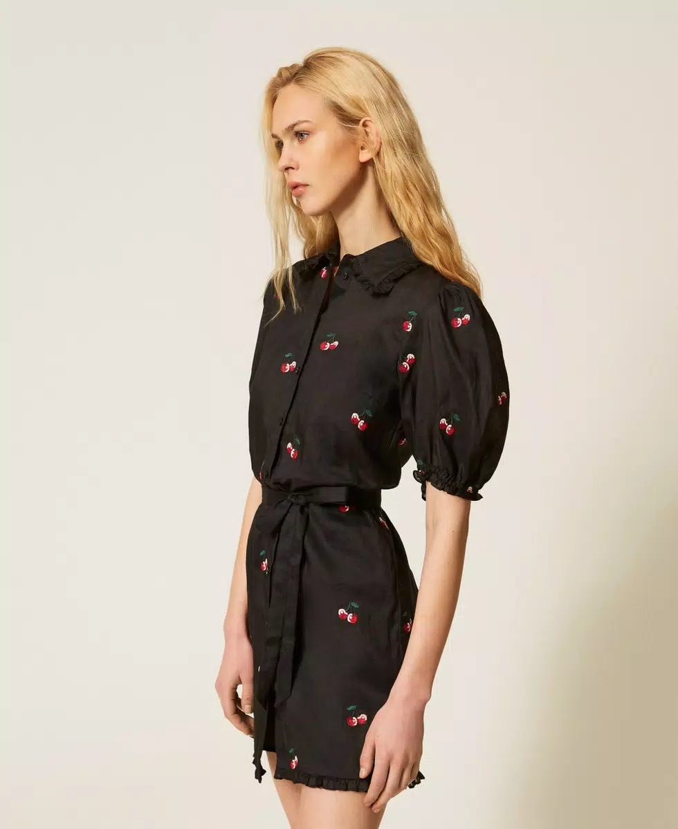 Vestido corto camisero de ramio con bordados de cereza por toda la prenda, un diseño exclusivo de Twinset. Presenta un cuello camisero, cierre con botones a tono, manga corta con frunces en la parte inferior, ribetes rematados con volantes, cinturón extraíble para anudar en la cintura, combinación a juego de muselina de algodón y corte recto.