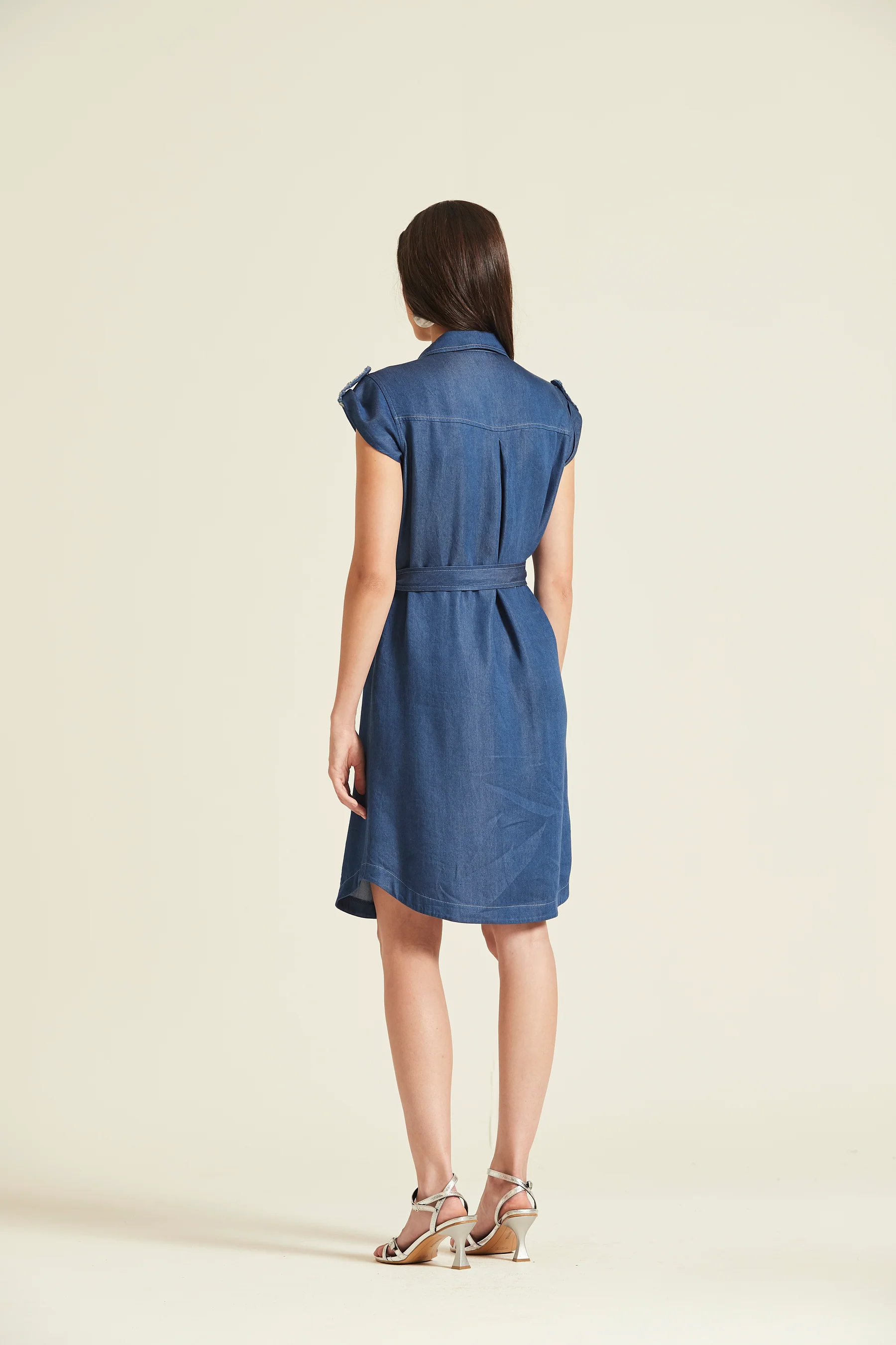 Vestido camisero de corte evasé confeccionado en una suave mezcla de Tencel y algodón. Presenta cuello clásico, manga corta con detalle de trabilla, bolsillos frontales y un cierre completo de botones metalizados. Incluye un cinturón del mismo tejido para definir la cintura.